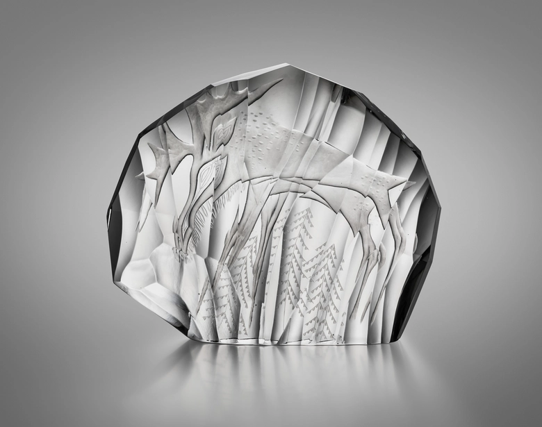 ガラス、磁器、銀食器、家具、紙幣、宝飾品、照明、空間……あらゆる素材と領域を横断しながら、幾何学と自然を融合させた洗練の造形を生み出したタピオ・ヴィルカラ。なかでも神話に着想を得たガラスのオブジェや、自ら開発した積層合板によるオブジェは、プロダクト・デザイナーとは異なる表現者の顔をのぞかせる。
