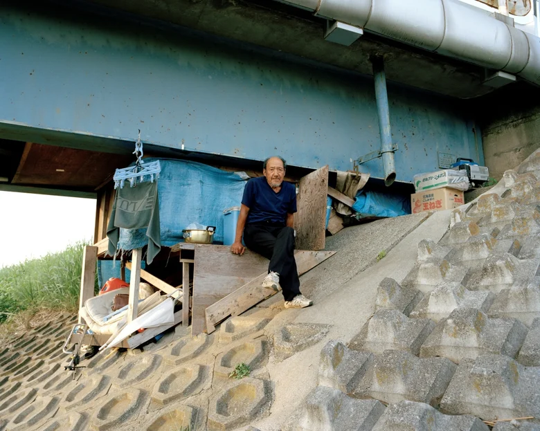 野口健吾は、日本各地の都市に暮らす路上生活者に取材し、その姿を写真に収めてきた。「庵の人々」シリーズでは、ブルーシートや廃材で作られた住居の構造と、そこに宿る生きる工夫を視覚化する。