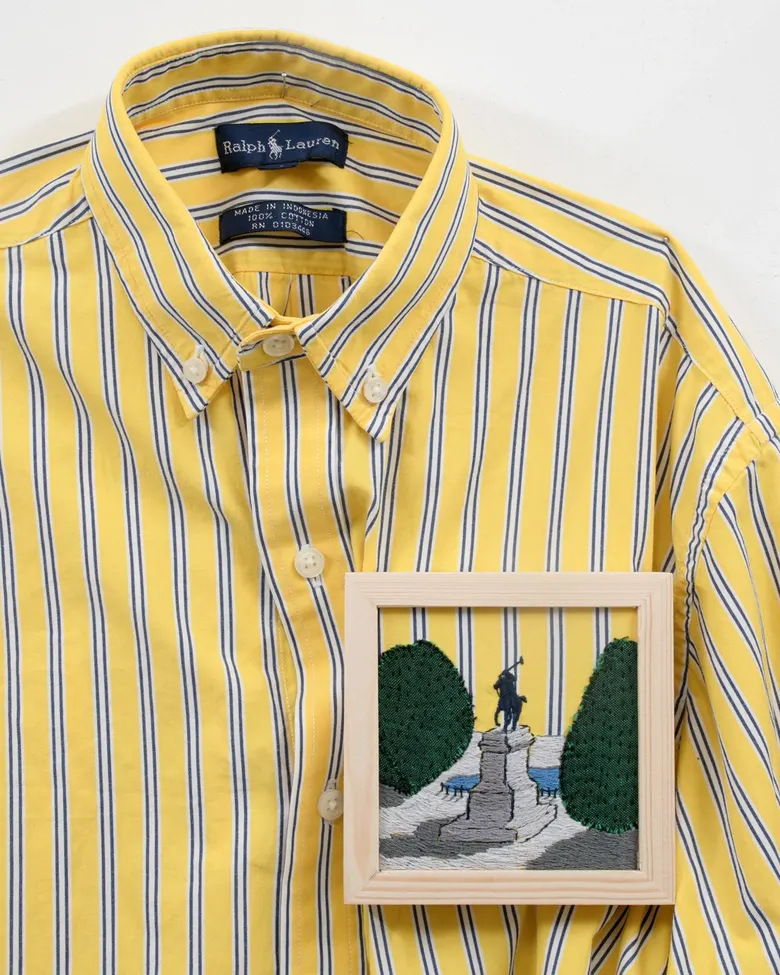 久村卓 《PLUS_Ralph Lauren_yellow striped shirt》 2025 年 シャツに刺繍、アプリケ 作家蔵