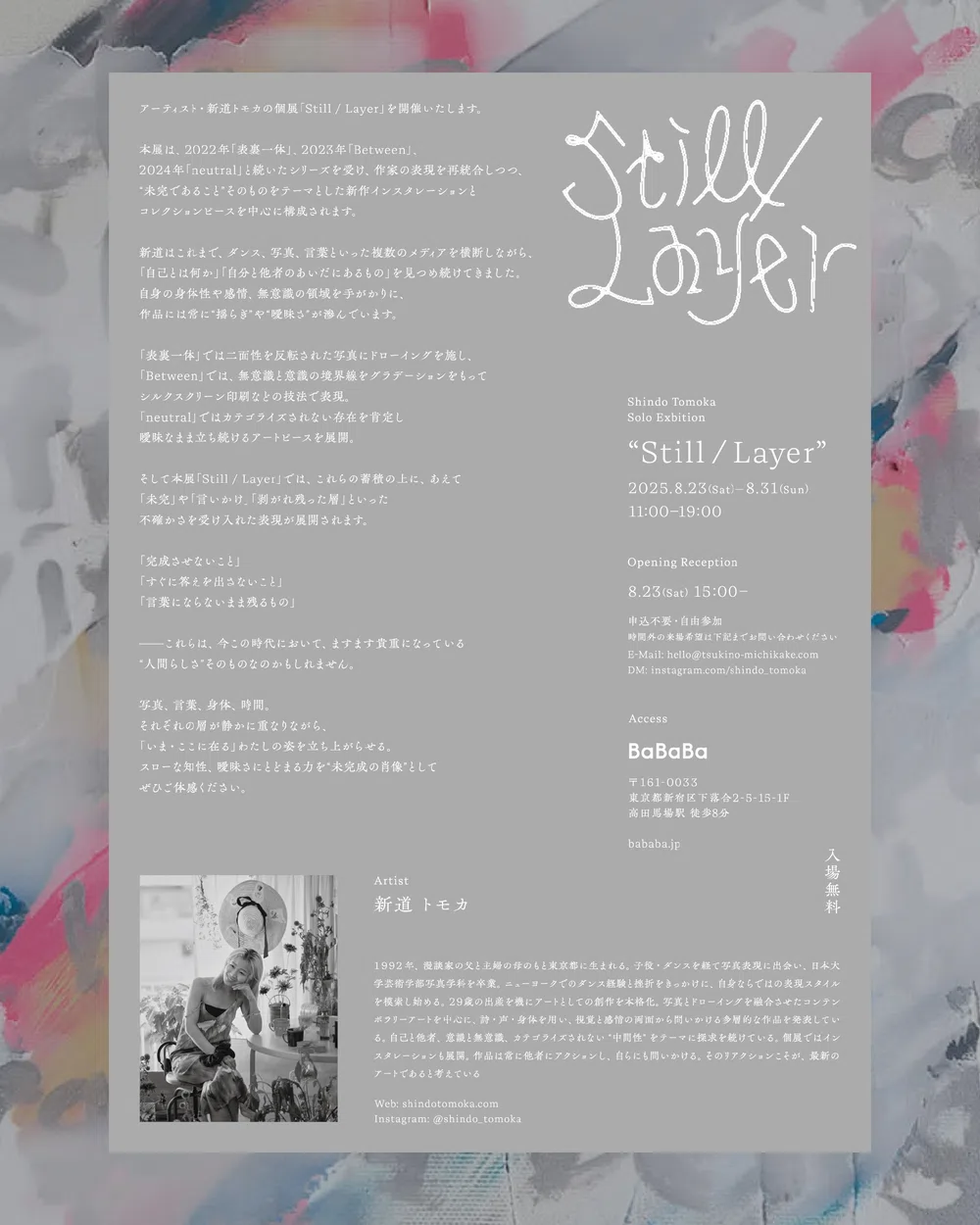体表現の中に描き出した。2024年の「neutral」では、カテゴライズされない存在として、曖昧なまま“立ち続けること”を選択し、写真とダンスの中間に漂う重心を提示。そして本展「Still / Layer」では、これらの蓄積の上に、あえて「未完」や「言いかけ」「剥がれ残った層」といった不確かさを受け入れた表現が展開される。「完成させないこと」「すぐに答えを出さないこと」「言葉にならないまま残るもの」これらは、今この時代において、ますます貴重になっている“人間らしさ”そのものなのかもしれない。