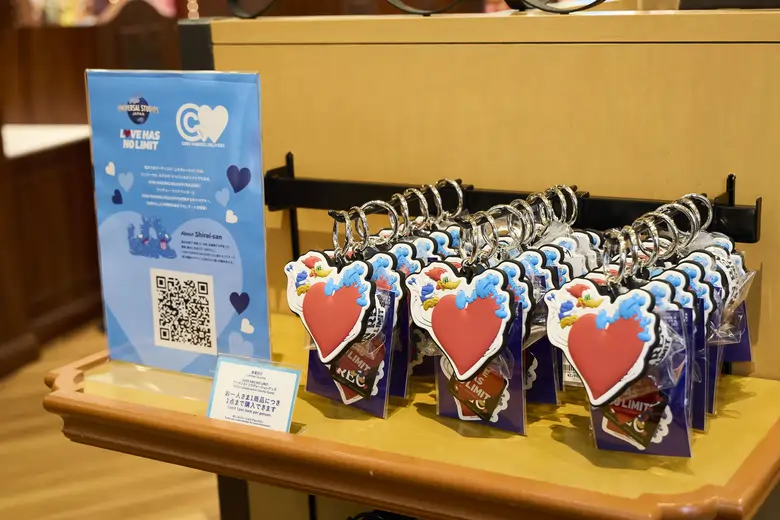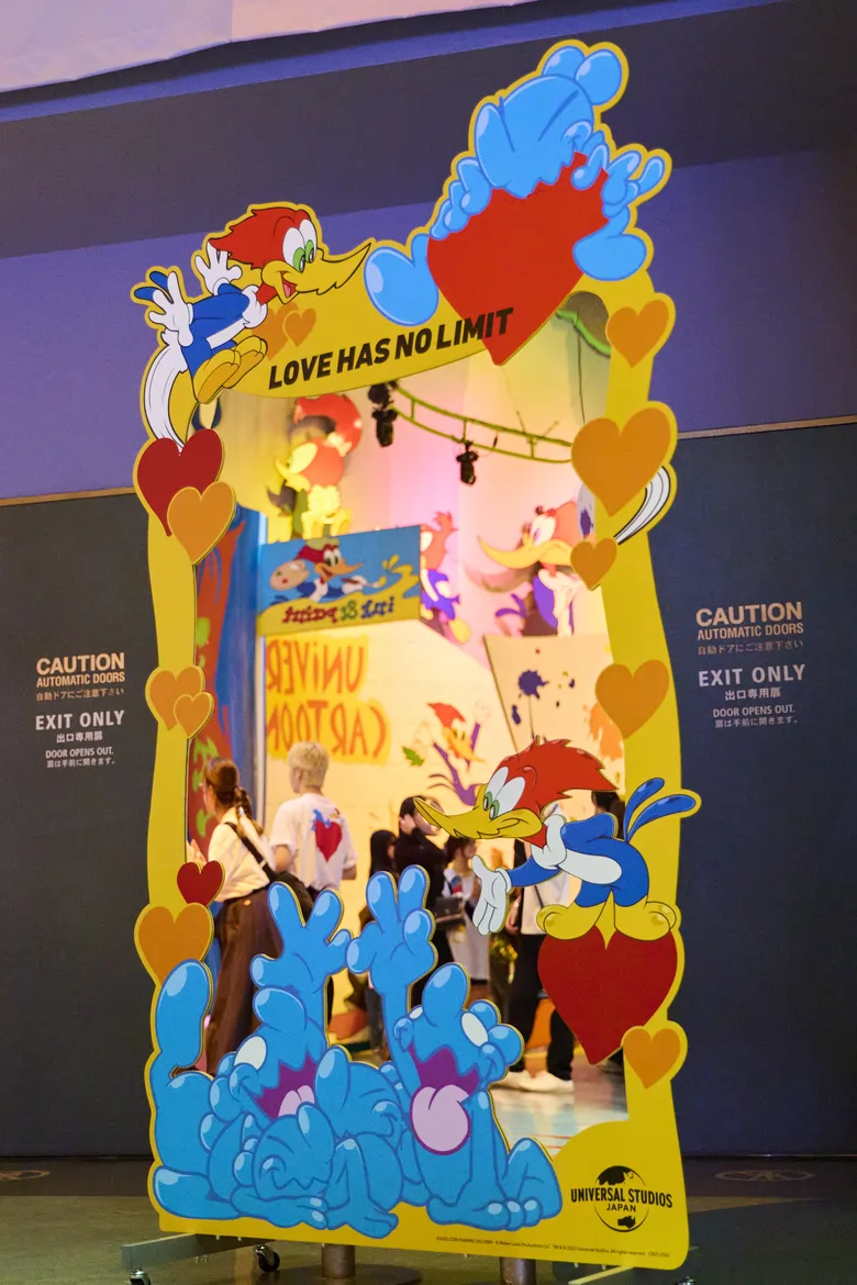 スぺシャルポップアップイベントの会場となったのは、アトラクション「アニメ・セレブレーション」のポストショーエリア。1 日限りの会場装飾として、LOVE HAS NO LIMIT のハートモチーフが一面にちりばめられ、いつものコミカルな空間から、LOVEが溢れる空間に様変わり。