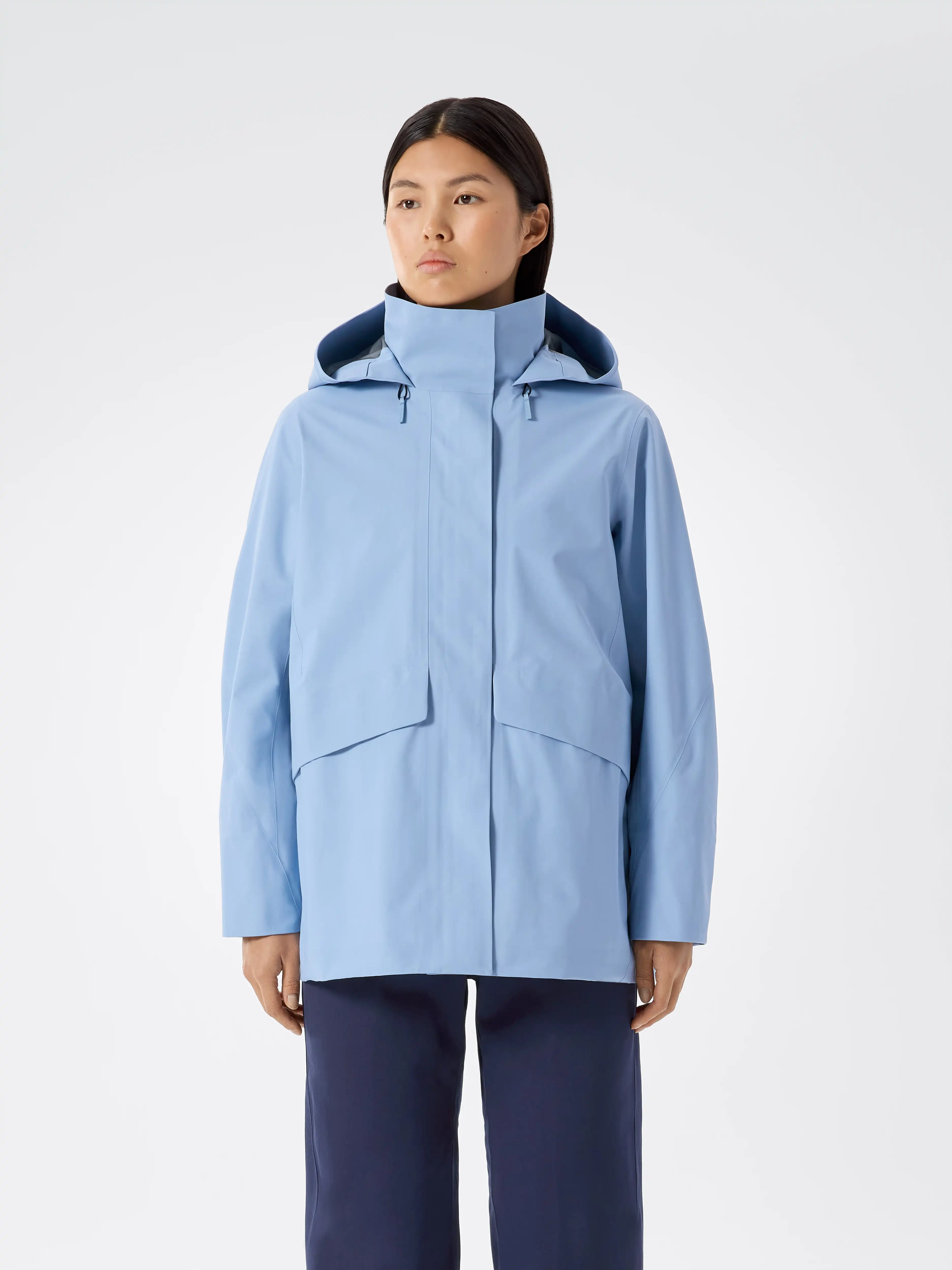 立体感のあるオーバーサイズフィットでGORE-TEX C-KNITを用いたコート。大きなフラップ付ポケットと背面のトレンチ風ベントが特徴。