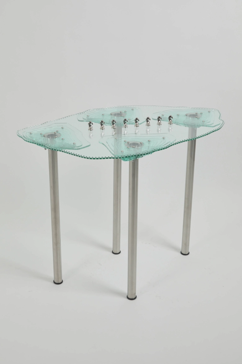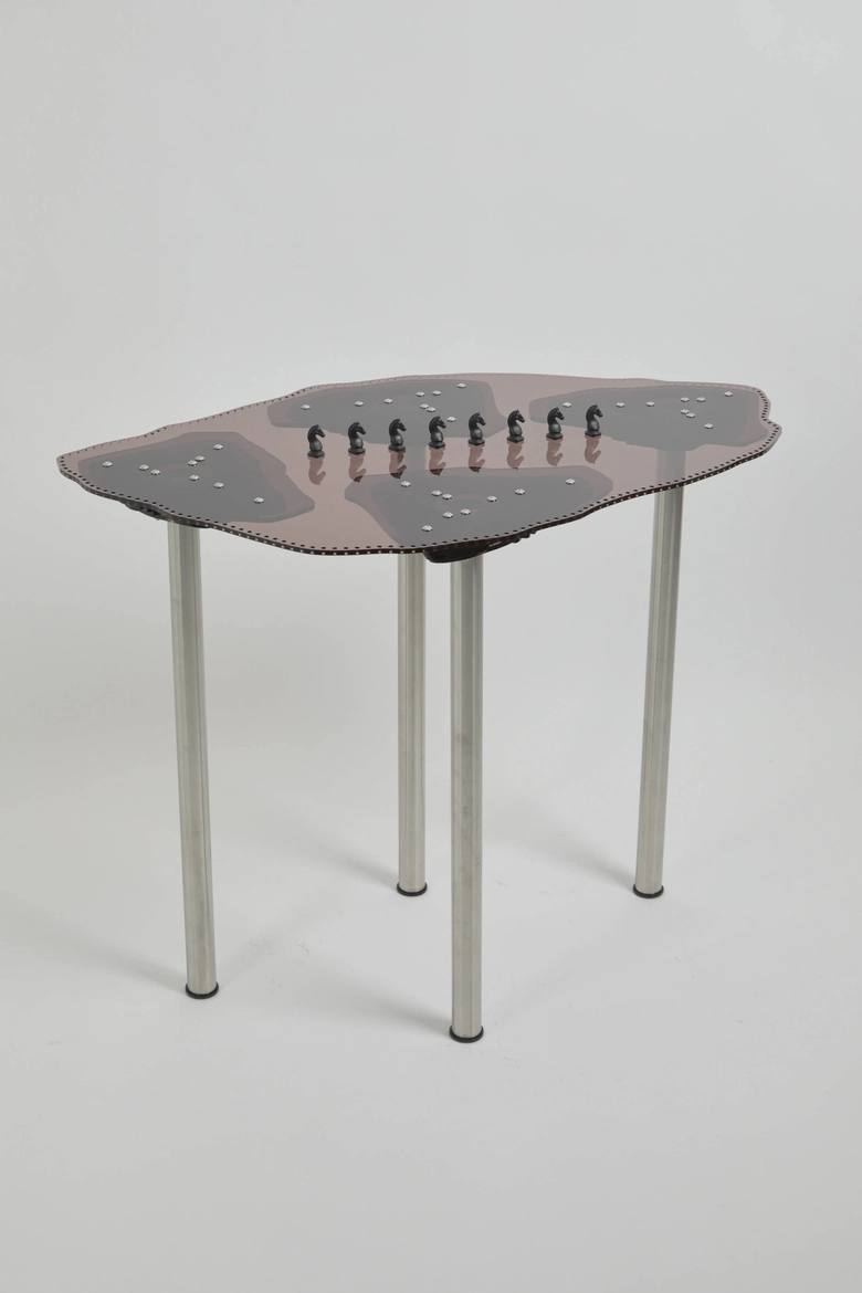 地層や地図の等高線といった自然界の有機的モチーフを落とし込んだテーブル。光の入り方で変化する陰影を楽しめる。脚部は取り外し可能。天板中央には機能を持たない「チェスの馬(ナイト)」を一列に並べた遊び心あるオブジェを配置。チェスの馬なしのシンプルデザイン(¥80,000税抜)も展開。