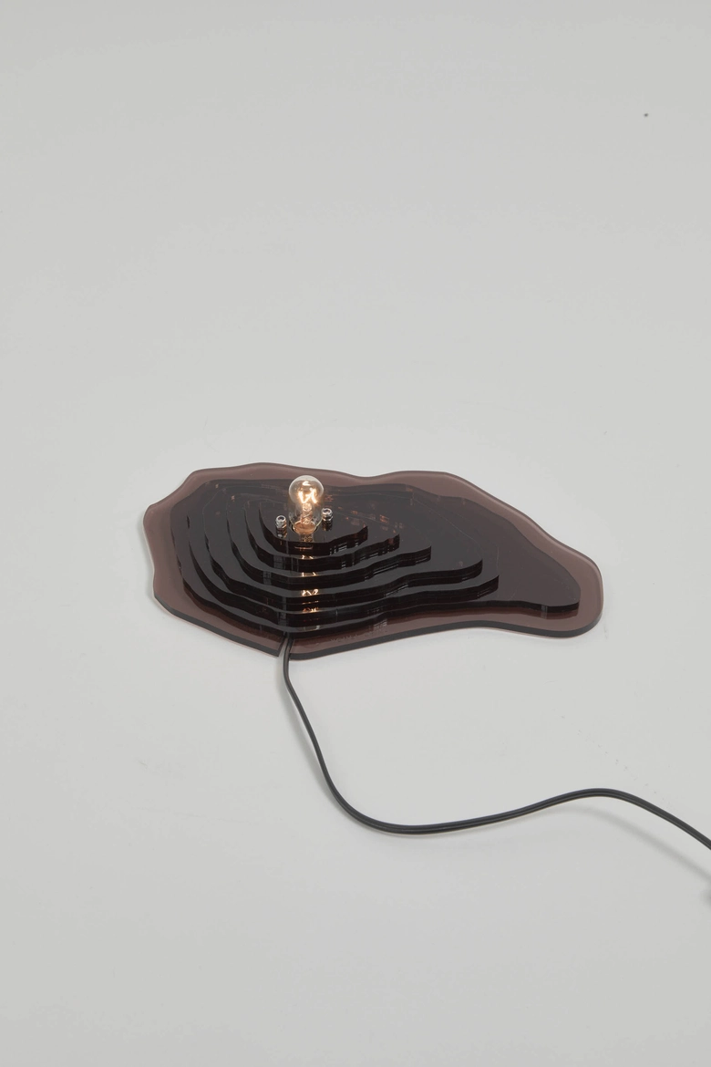 等高線モチーフを用いた彫刻的なデスクランプ。どこか懐かしい科学キットのような佇まいで、インテリア性と実験的な遊び心を兼ね備える。