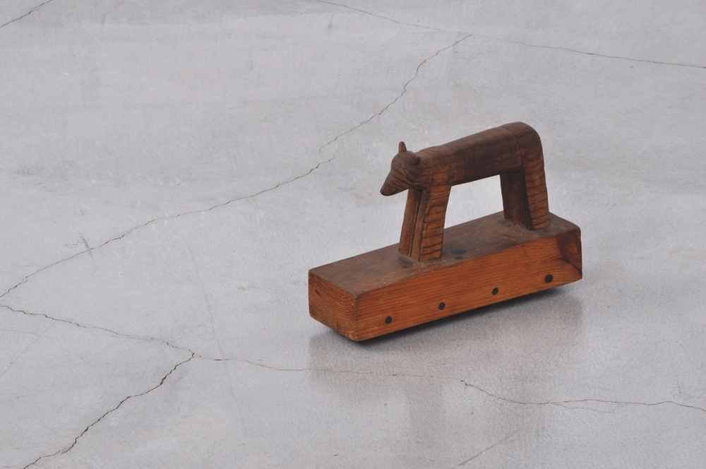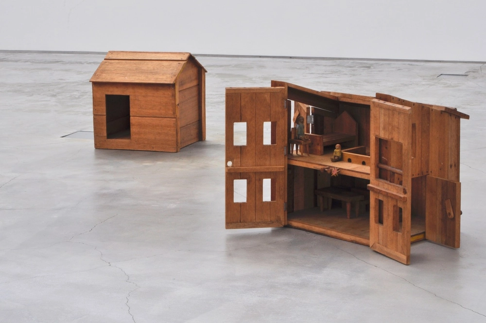 人形や家、糸巻きの車といった玩具は、作家の身近にあった素材を用いながら、柔らかな温もりと驚くほど彫刻的な造形を備えている。物であったはずのものは日常から離れ、お伽話やSFの世界へと羽ばたくような想像力が息づいている。