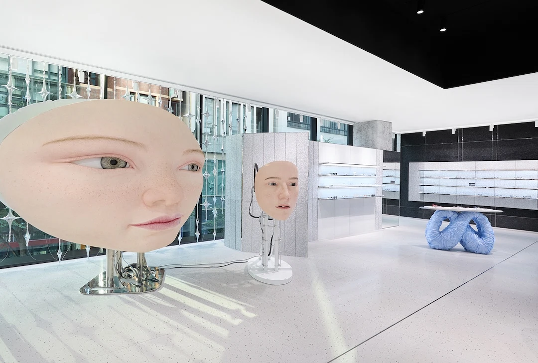 2階には「ジャイアント・ヘッド キネティックオブジェ」を設置。ゆっくり瞬きを繰り返し、互いを意識するように視線を動かす巨大な顔の造形は、人間の思考や感情、他者との関係性を象徴的に表現している。