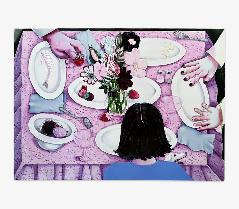 Nikki Maloof, Pink Table, 2025, Oil on linen, 177.8 × 127 cm, Courtesy of the artist and Perrotin