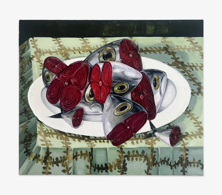 《Fish Heads》(2025)は、三角形や円、正方形など幾何学的な構造が画面を支配し、写実を超えて絵画そのものが抽象的な構築物であることを示す。ありふれた魚の頭が、空間や時間、始まりと終わりといった普遍的なテーマを呼び起こす。