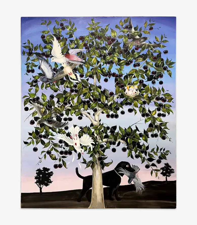 《Summer》(2025)の樹木は、巣で鳴くヒナ、真紅の羽を広げる群れ、血に染まり落下する鳥まで、誕生から死までの循環を抱え込む。堂々とそびえるその姿は「生命の木」を思わせ、鮮烈な色彩とともに、絵を描く歓びそのものを響かせている。