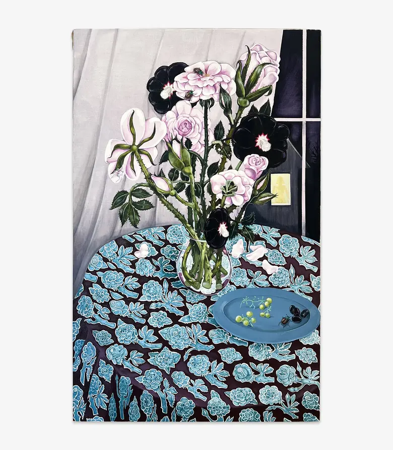 《Night Bouquet》(2025)では、花瓶とテーブルクロスが同列に扱われ、散った花びらが布の花模様に重なり、模様までもしおれて見える。そこに群がる昆虫は、人生の儚さを示すヴァニタスの伝統を想起させ、暗闇に浮かぶ窓の裸婦の影は、現実というより幻影のように映る。静物画の枠を超え、現実と想像の境界を揺らす作品だ。
