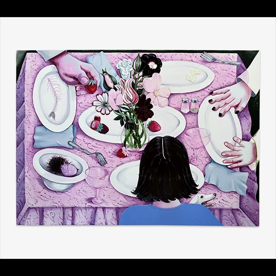 《Pink Table》(2025)では、中央に置かれた花束と質素な食卓が同じ画面に並び、華やかさと不穏さが交錯する。豪華なオウムチューリップや深紅のポピーと、食べかけの皿やねじれたフォークの対比。画面の端の手や、口紅の残るグラスが物語を攪乱し、観る者に悲劇の予感を忍ばせる。それが何なのかは明かされず、想像の余白が開かれている。