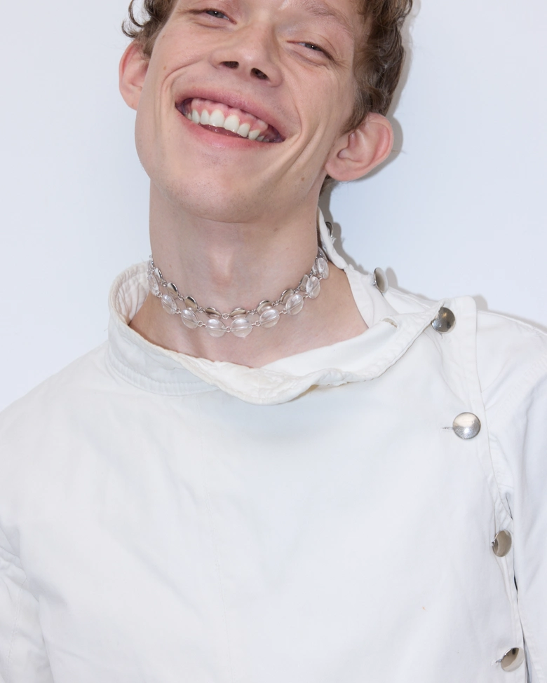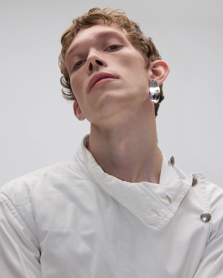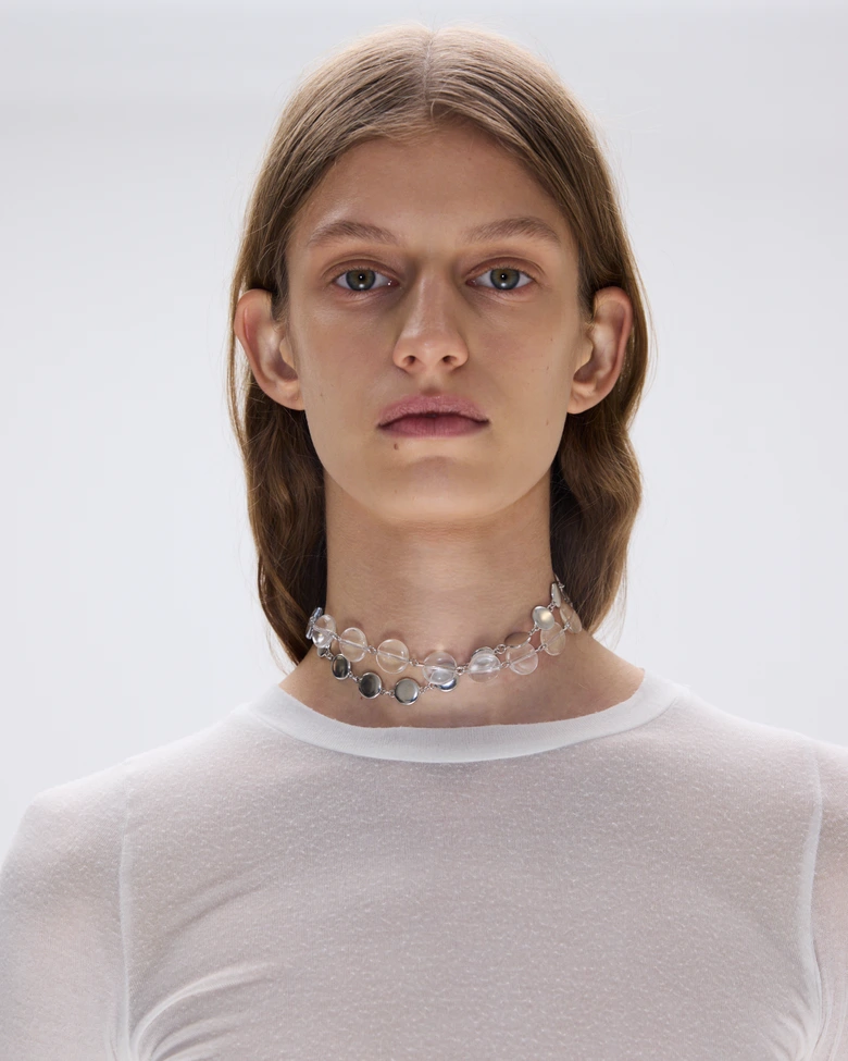 デザイナーには、<Prada(プラダ)>や<Bottega Veneta(ボッテガ・ヴェネタ)>、<Acne Studios(アクネ ストゥディオズ)>、<Y/Project(ワイプロジェクト)>、<Kiko Kostadinov(キコ・コスタディノフ)>などを手がけてきた<Isa Kauffman(イザ・カウフマン)>を迎えて制作された。光学天文学や初期の科学図版、日本人アーティスト高谷史郎によるパフォーマンス「Tangent(2024)」の要素をムードボードに取り入れ、結晶のような精緻さと、暗い幾何学の世界を探求している。