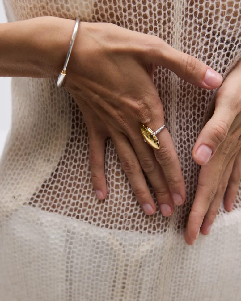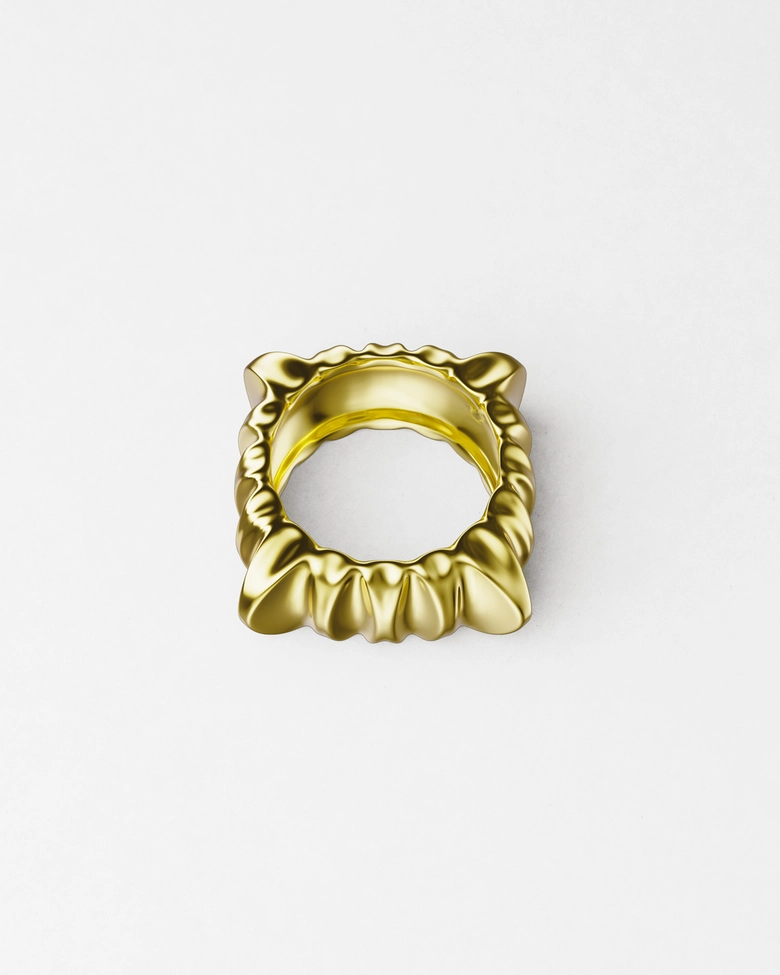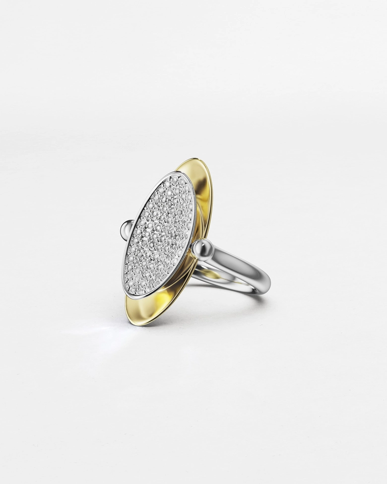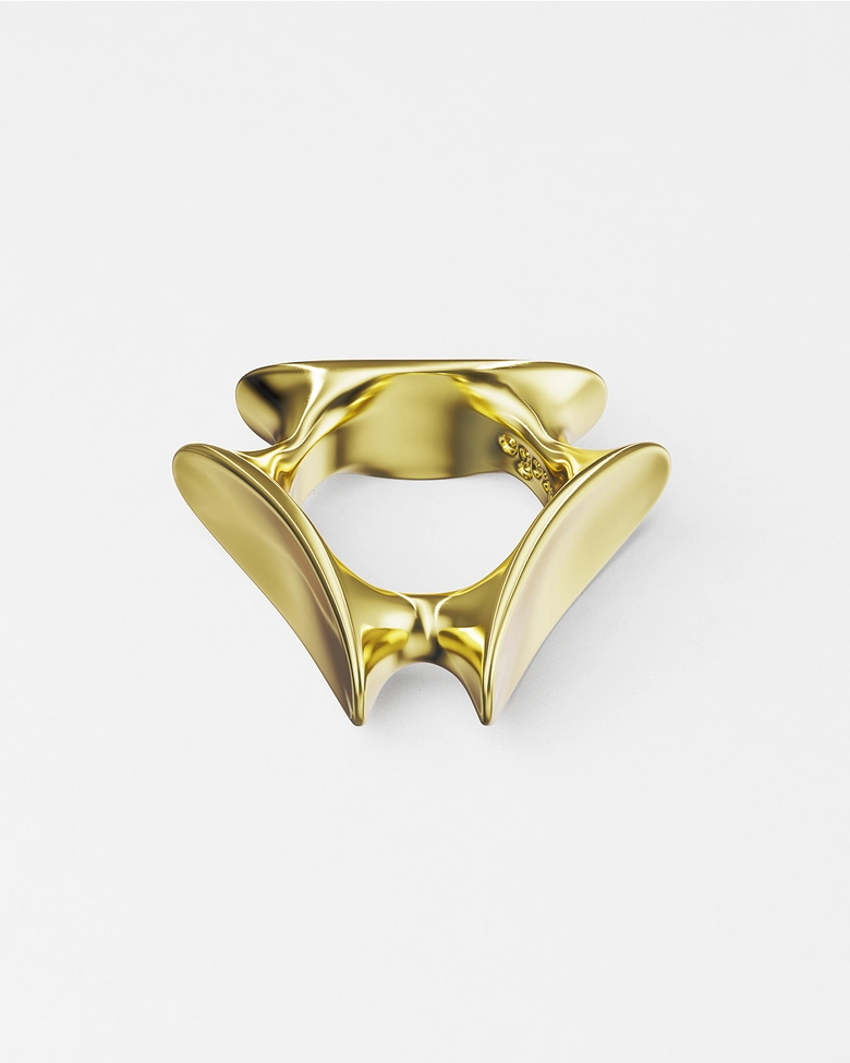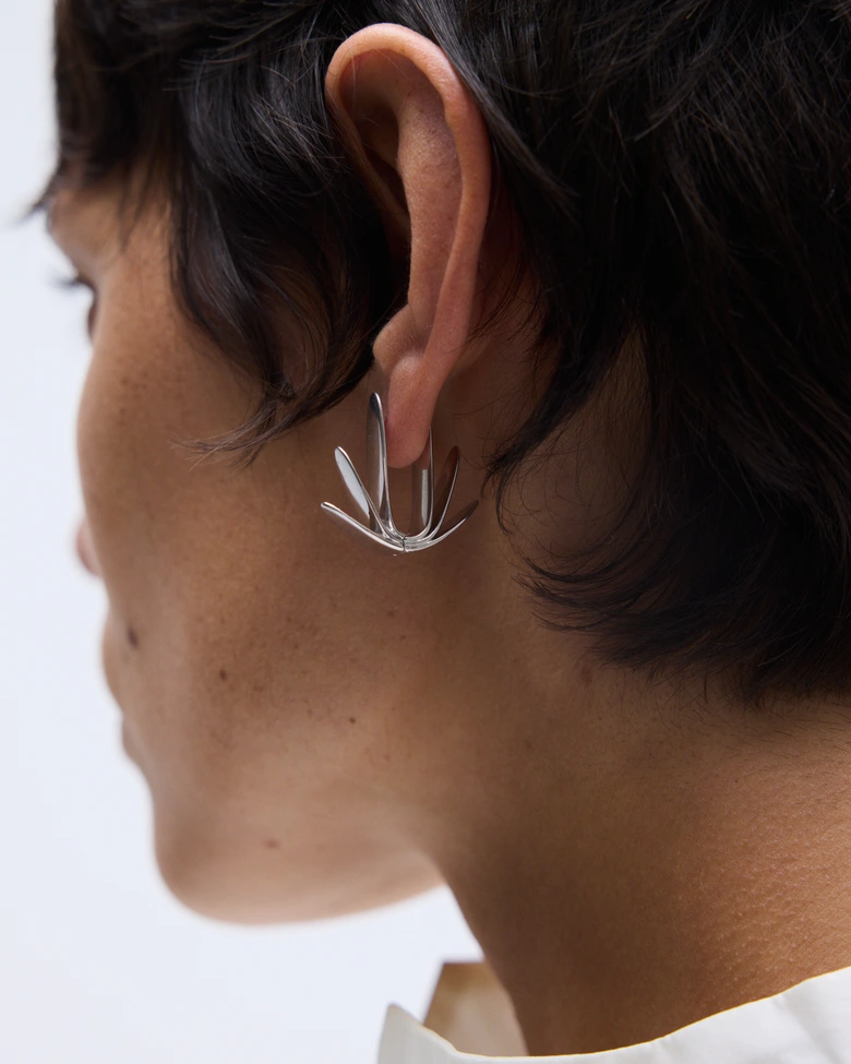 本コレクション「ECLIPSE」は、光と影が交錯し、秩序が一瞬崩れる“日食”の現象からインスピレーションを受けている。明暗のはざまに生まれる歪みや緊張をジュエリーとして表現し、まるで次元の狭間に漂うような彫刻的フォルムが特徴だ。