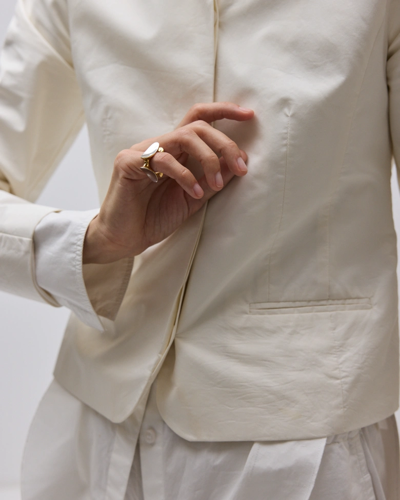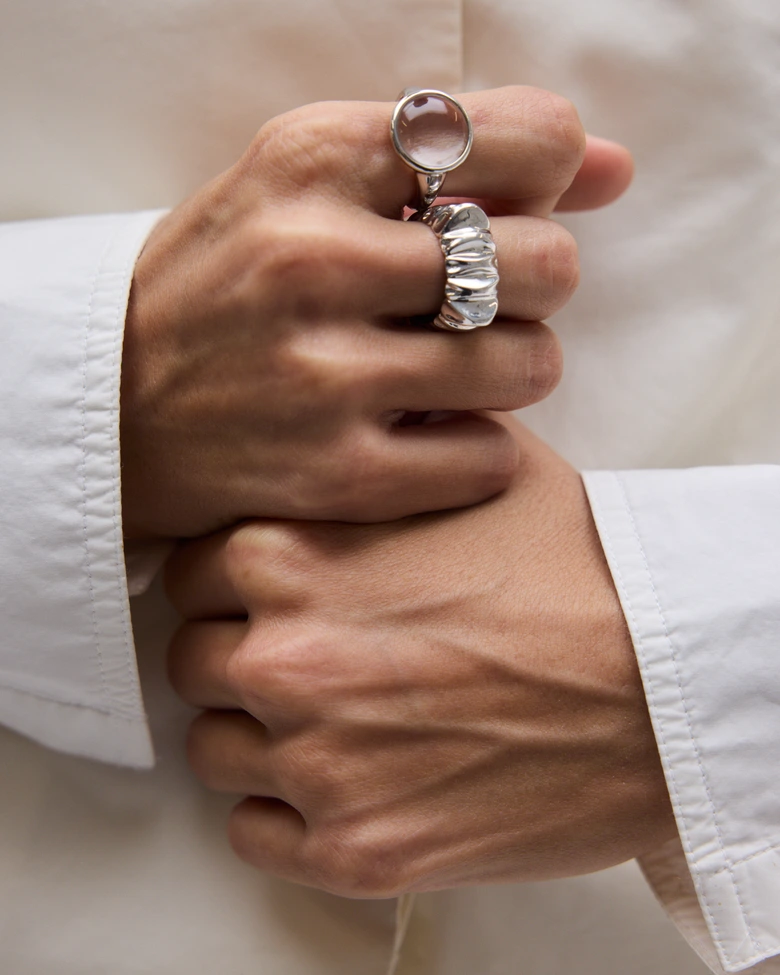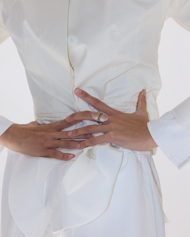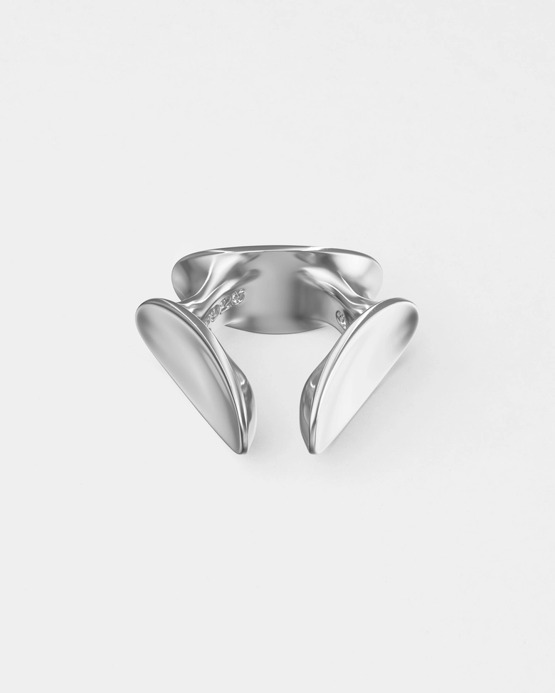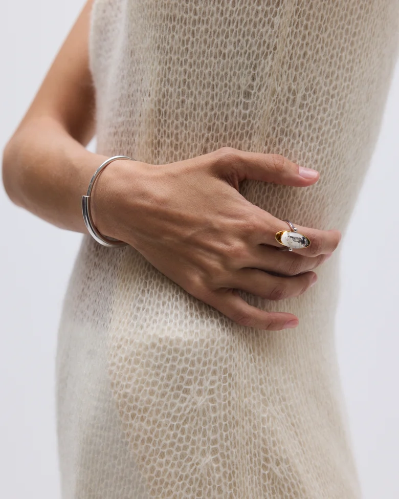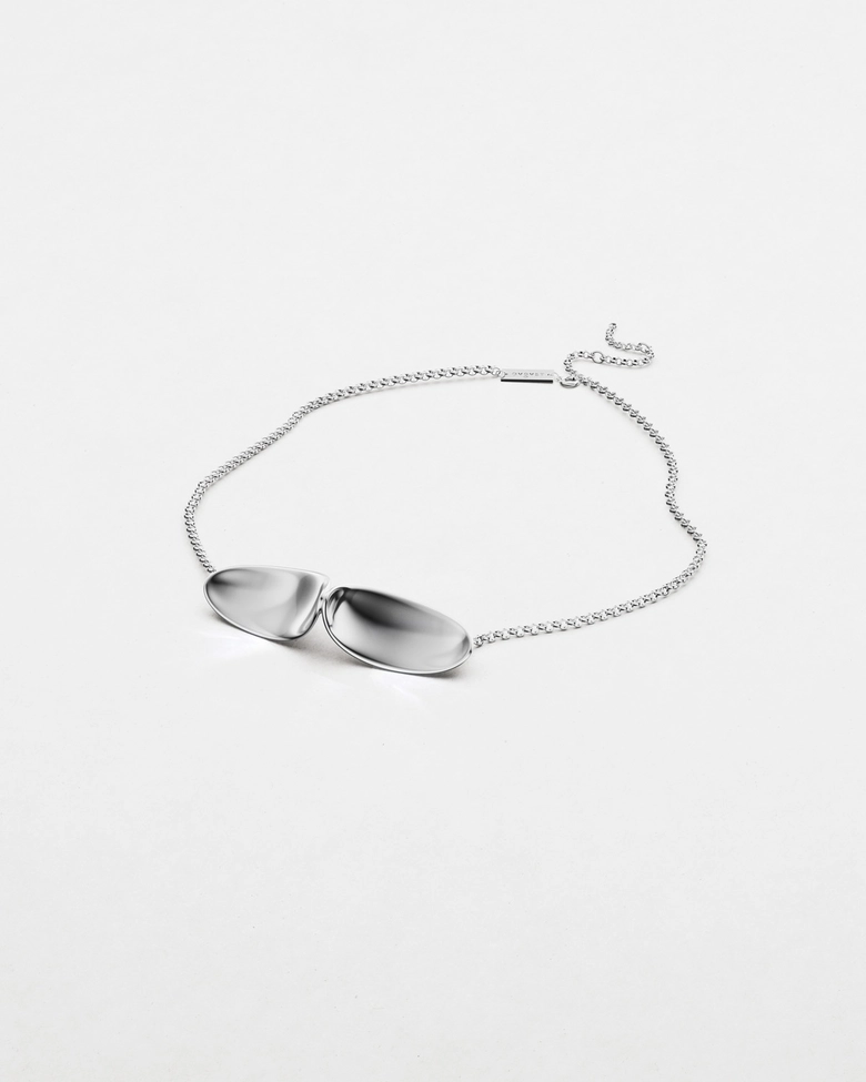 本コレクション「ECLIPSE」は、光と影が交錯し、秩序が一瞬崩れる“日食”の現象からインスピレーションを受けている。明暗のはざまに生まれる歪みや緊張をジュエリーとして表現し、まるで次元の狭間に漂うような彫刻的フォルムが特徴だ。