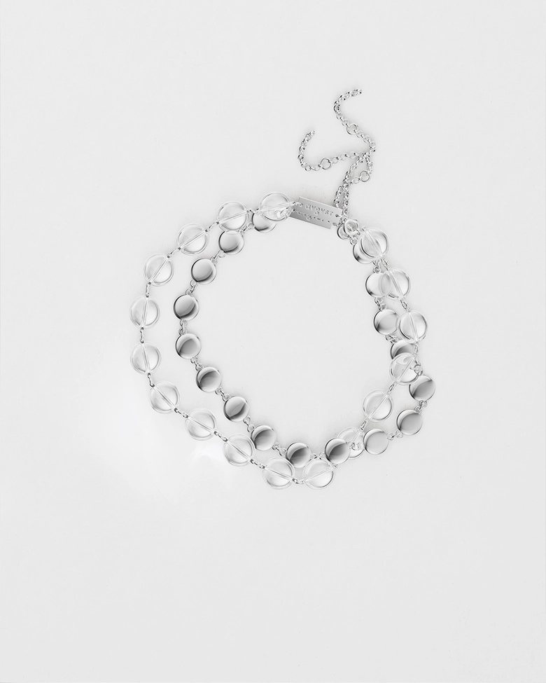 月と太陽の交差を描く二重の円モチーフが印象的なチョーカー。