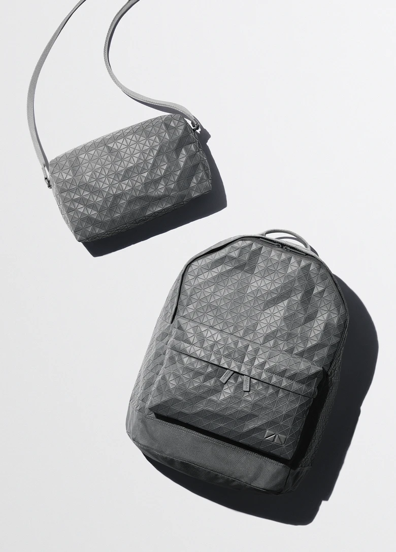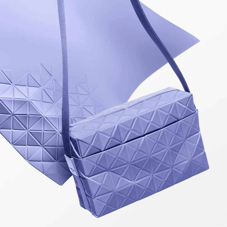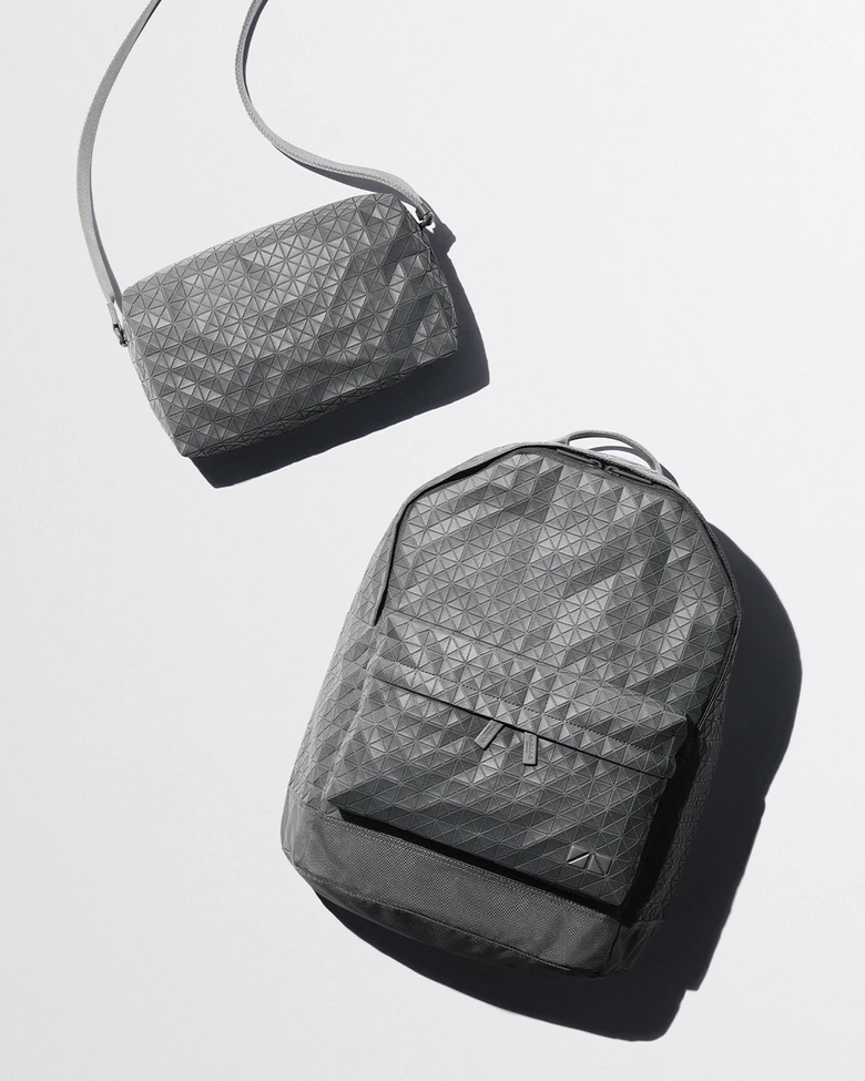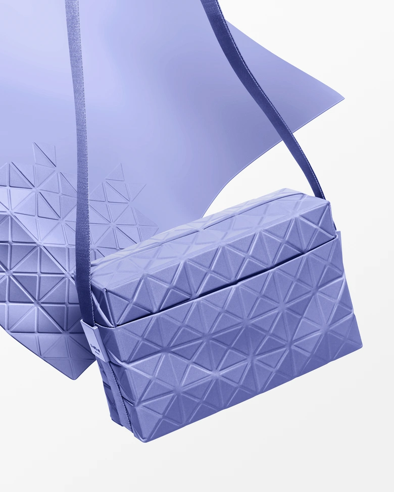 ブランドを象徴する二等辺三角形ユニットを“生地に内包”し、平面から立体へ展開する構造美を際立たせたシリーズ。ワントーンのミニマルなパーツ、厚みのあるナイロンハンドル、角の樹脂パーツで美しさと耐久性を両立。新色PURPLISH BLUEが加わる。