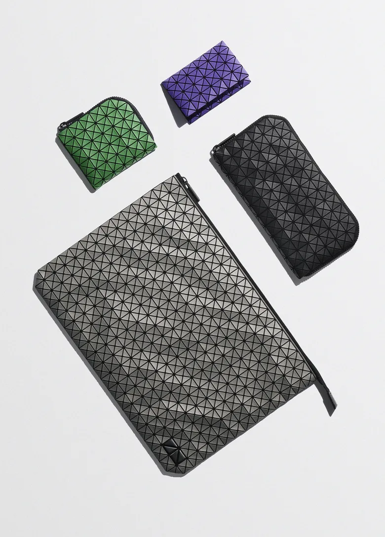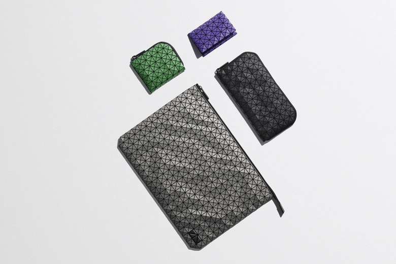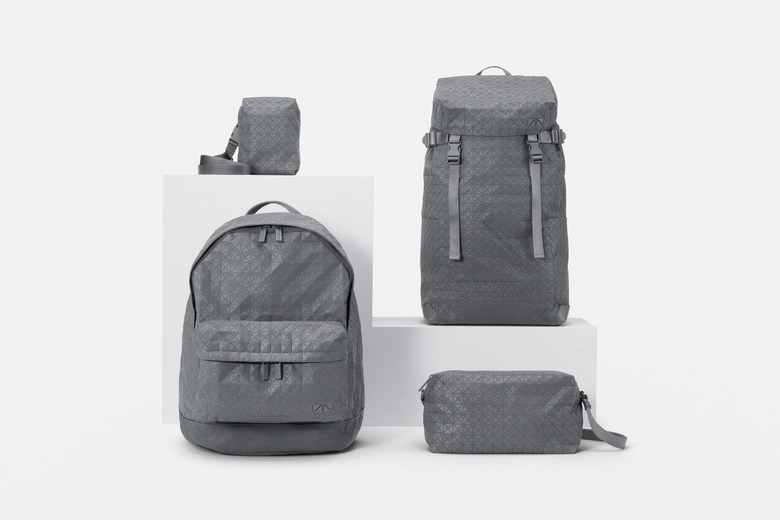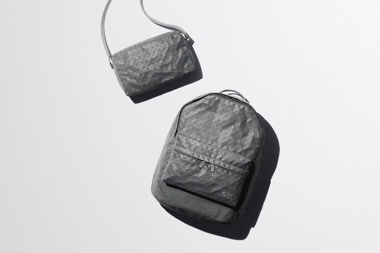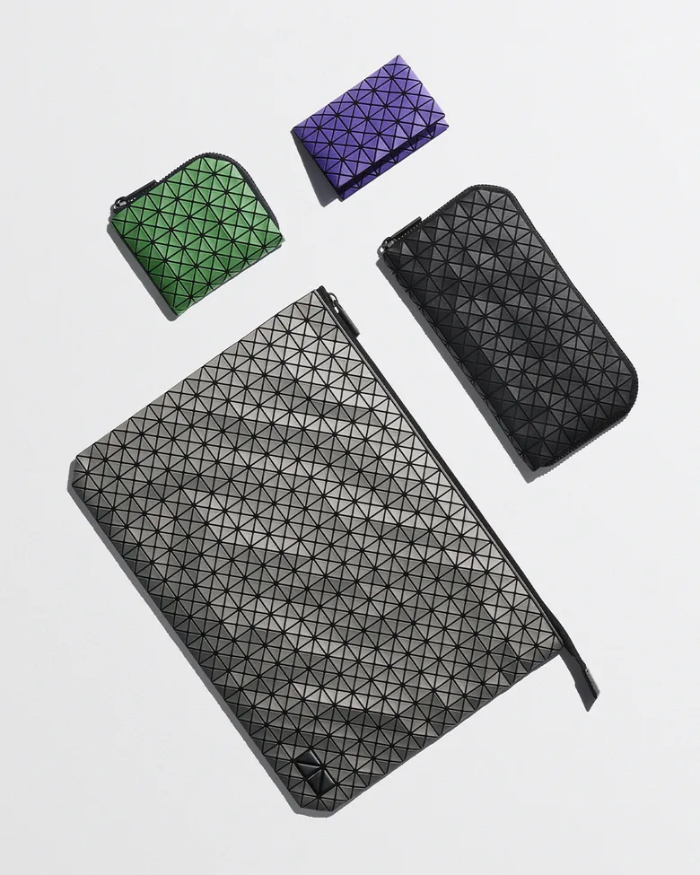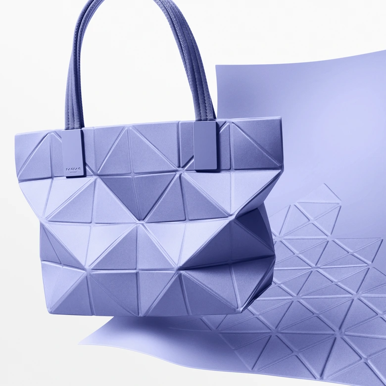 ブランドを象徴する二等辺三角形ユニットを“生地に内包”し、平面から立体へ展開する構造美を際立たせたシリーズ。ワントーンのミニマルなパーツ、厚みのあるナイロンハンドル、角の樹脂パーツで美しさと耐久性を両立。新色PURPLISH BLUEが加わる。