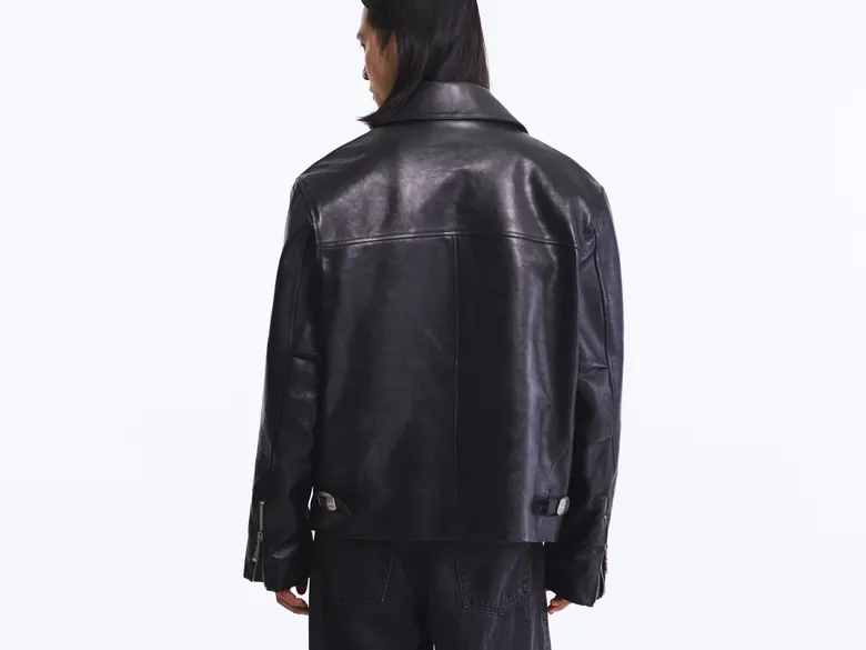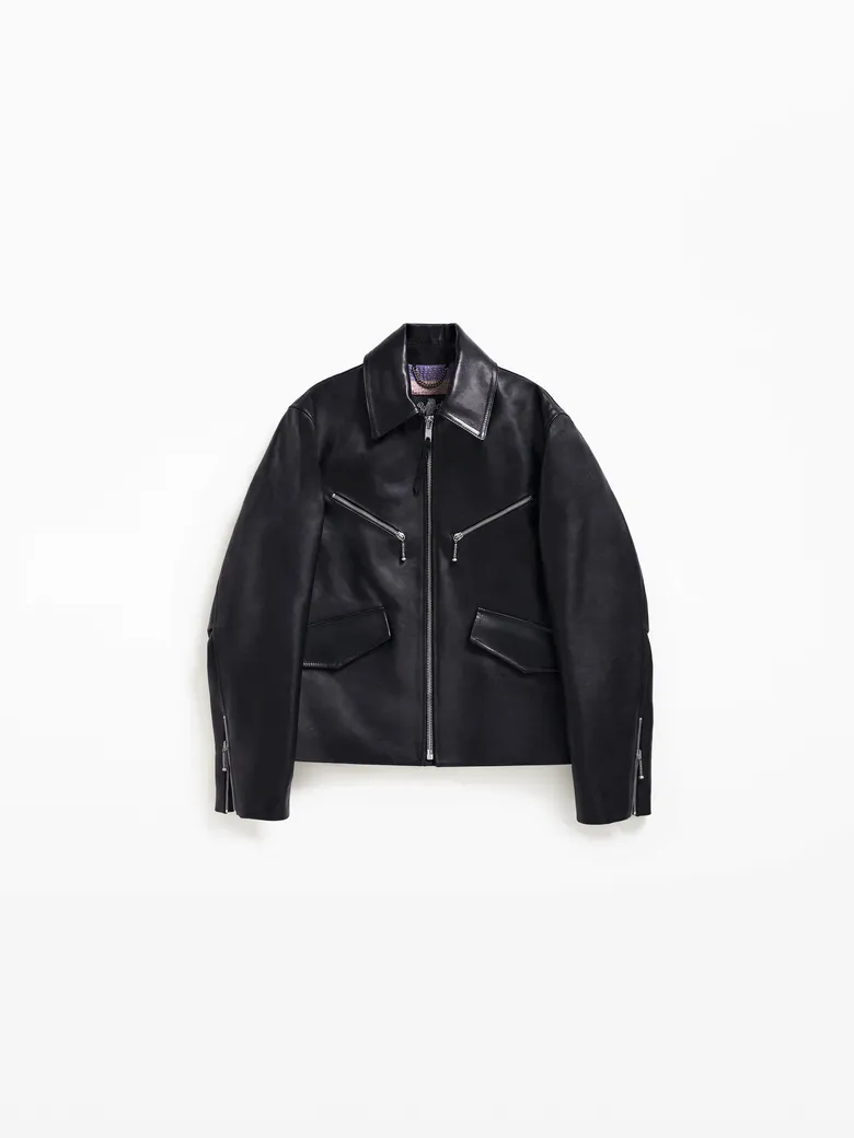 「Rizon Jacket」は、ベジタブルタンニン鞣しのカーフスキンを採用。しなやかで自然な表情を持つ素材は、着用を重ねることで独自の風合いを育む。長めの袖とリラックスしたフィットにより、流れるような現代的なシルエットを演出。また、内側にはインド女性が纏っていた古いサリーを再利用した手刺しキルティングのカンタブランケットを使用しており、ひとつとして同じものがないライニングがそれぞれのガーメントに文化的記憶と個性を宿す。