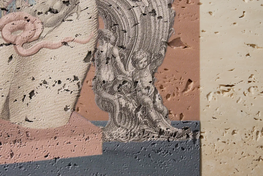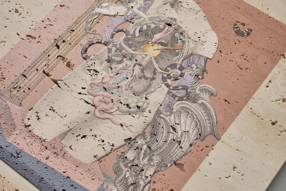 メインビジュアルともなっている新作「She,Still Life I,II,III」は、ギリシャ神話の三美神(カリス)を象徴に、大理石にプリントを施したシリーズ。さらには、心臓を建築物のように構造分解し木材へと転写した「Serene Operation I,II」など、質感のコントラストと共に、他者との違いを受け入れる視点を投げかける。