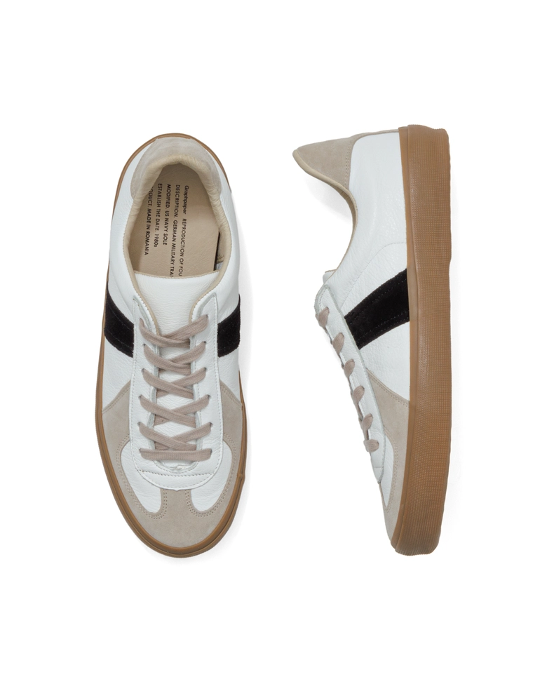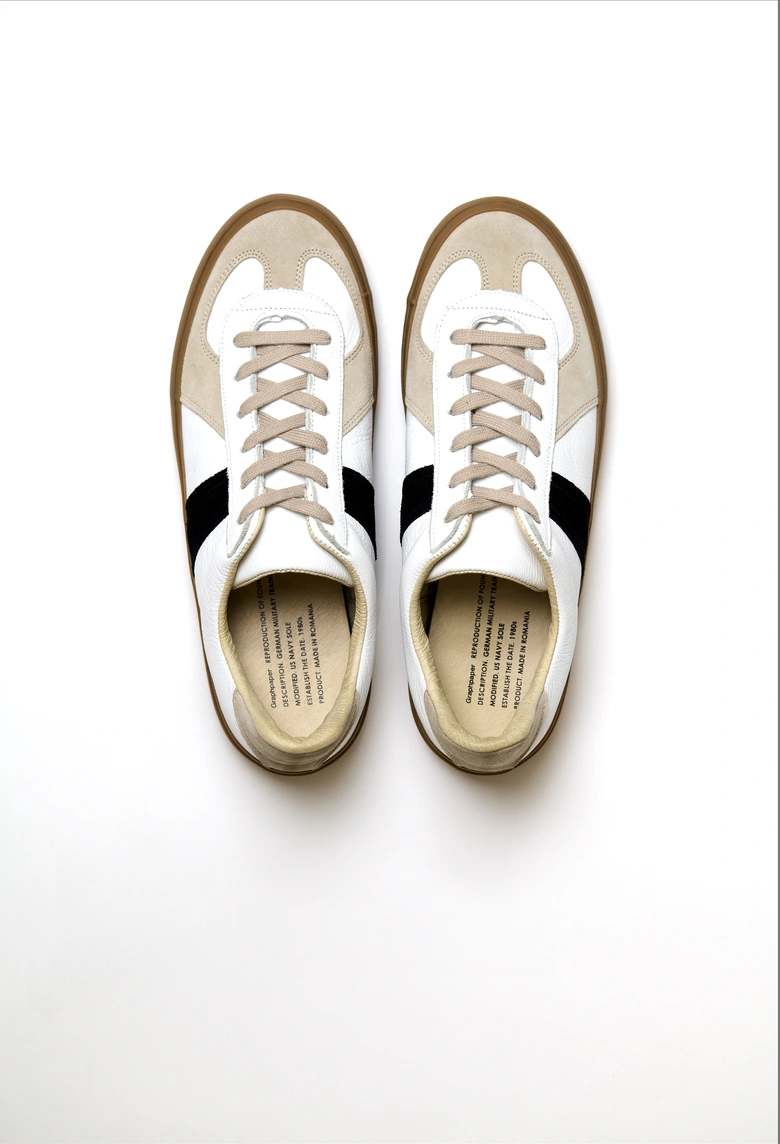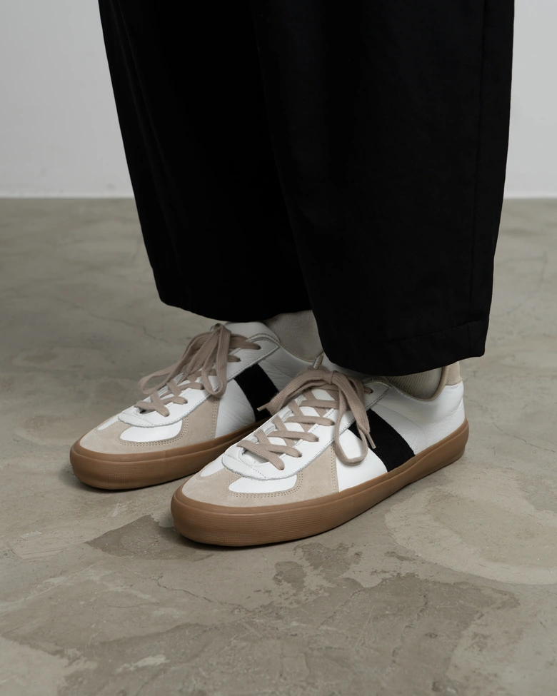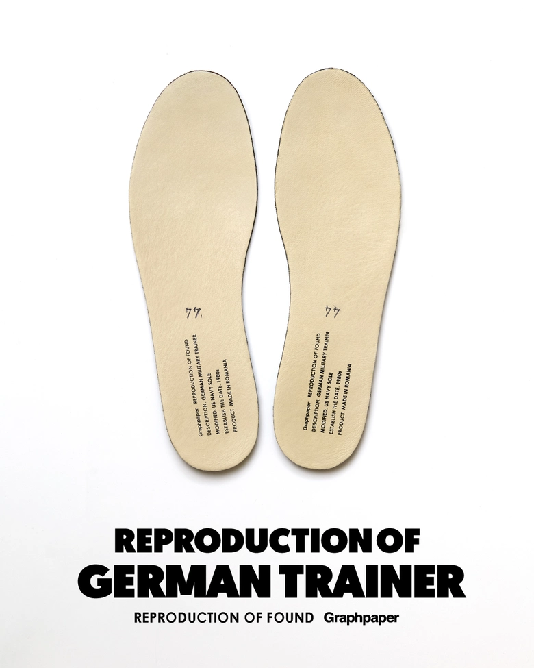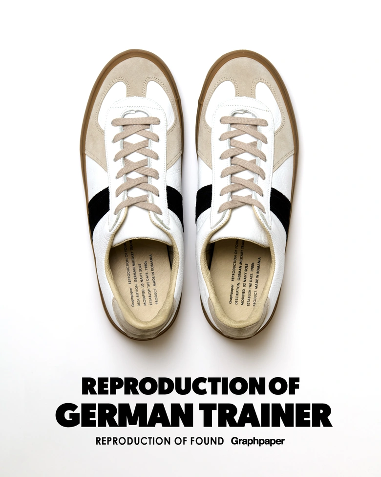 今回は1980年代にかけてドイツ軍で使用されていたトレーニングシューズの名作「ジャーマントレーナー」をベースに、アメリカ海軍のデッキシューズに見られるグリップ力に優れたラバーソールを組み合わせて構成されている。