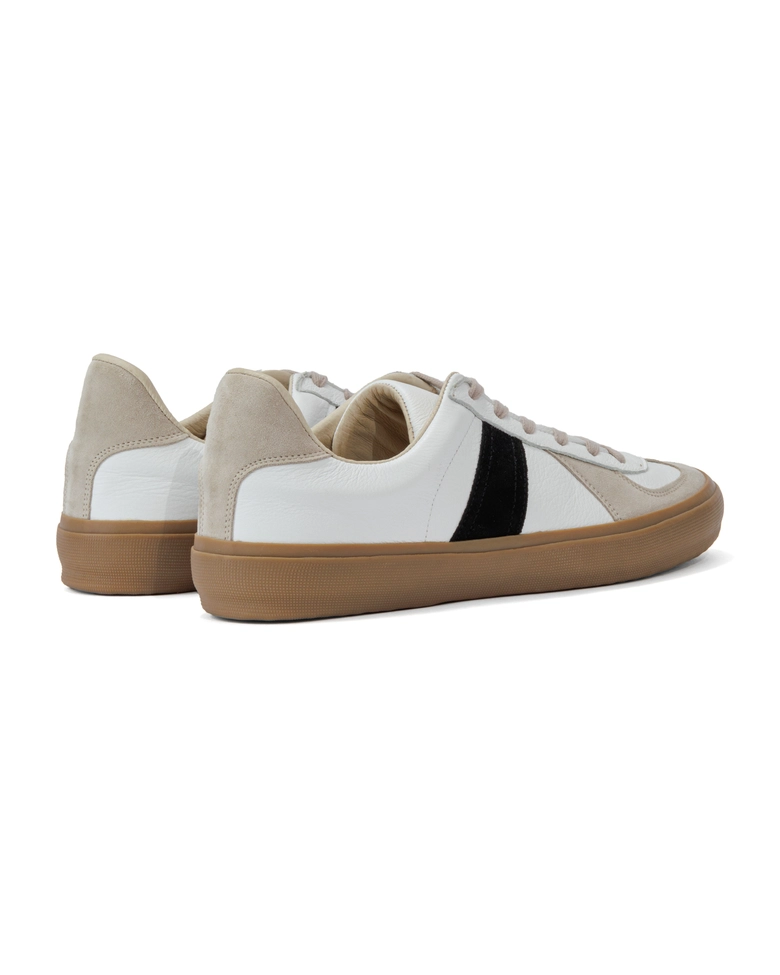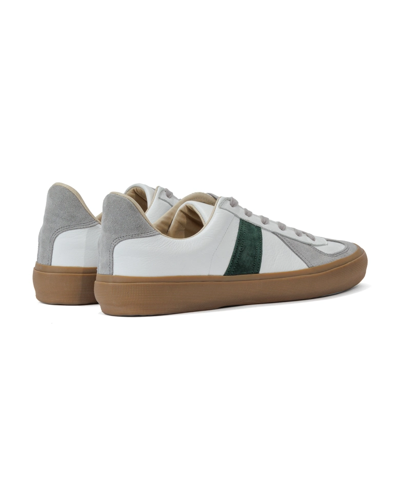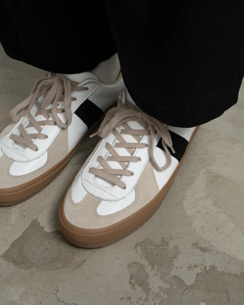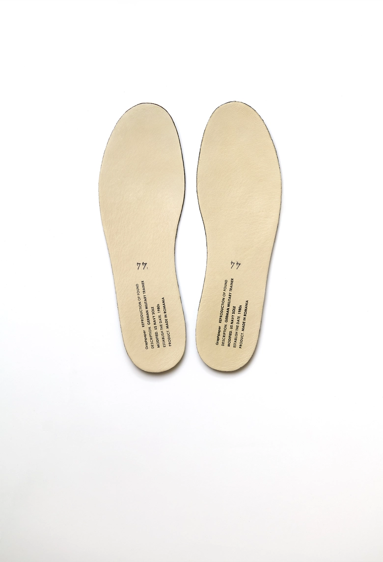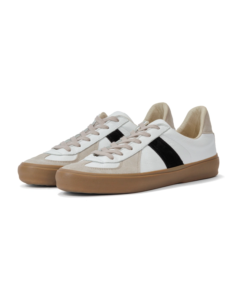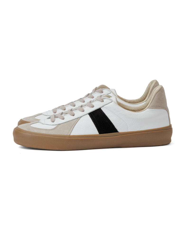 今回は1980年代にかけてドイツ軍で使用されていたトレーニングシューズの名作「ジャーマントレーナー」をベースに、アメリカ海軍のデッキシューズに見られるグリップ力に優れたラバーソールを組み合わせて構成されている。