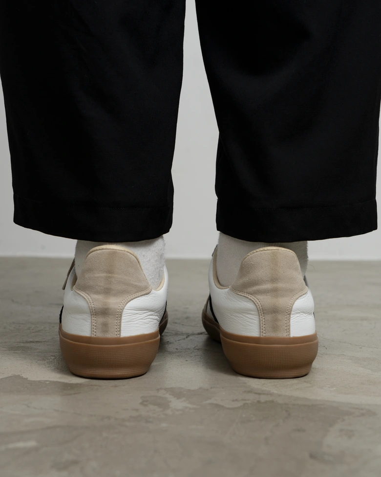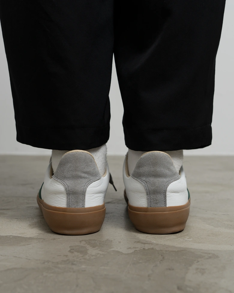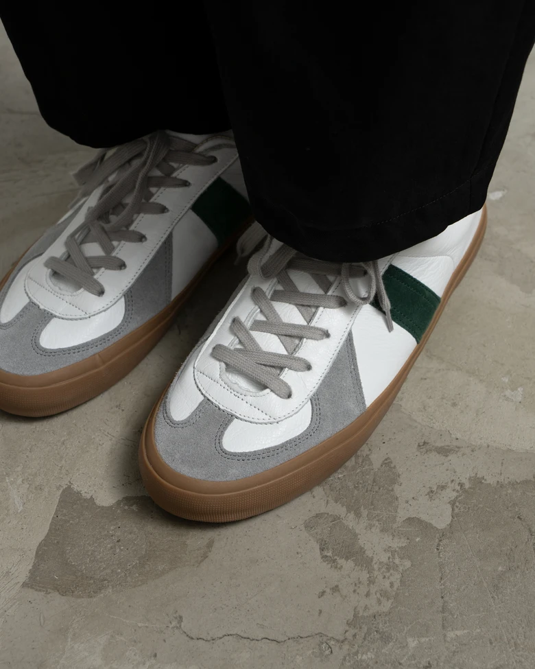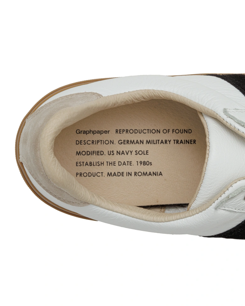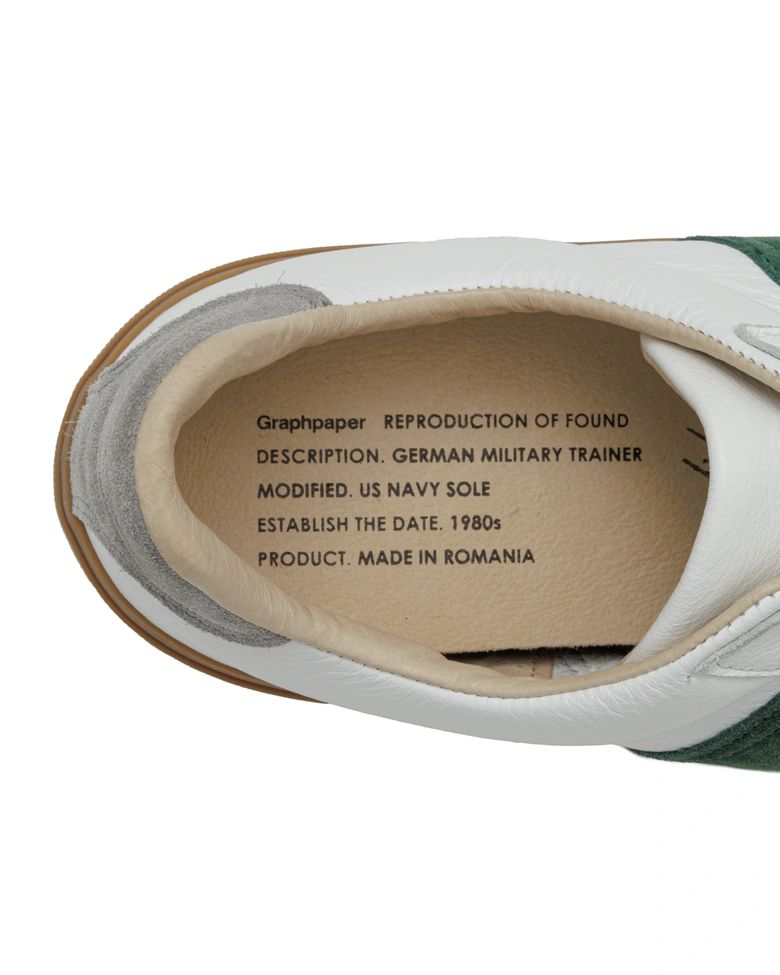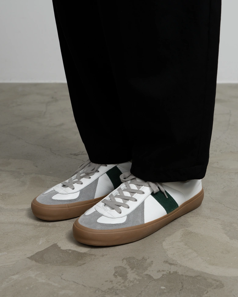 ホワイトを基調に、グレージュやグリーンを随所に配置することで、<Graphpaper>2025年秋冬シーズンのテーマである“ARRANGEMENT”を表現している。上質なイタリアンスエードレザーとソフトでしなやかなイタリアンナッパレザーを採用し、軍用トレーニングシューズを生産していたファクトリーでハンドメイドで製作されたアイテムは、ミリタリーの文脈を持ちながらも無骨すぎず、様々なスタイリングに調和するモダンなシューズに仕上がっている。