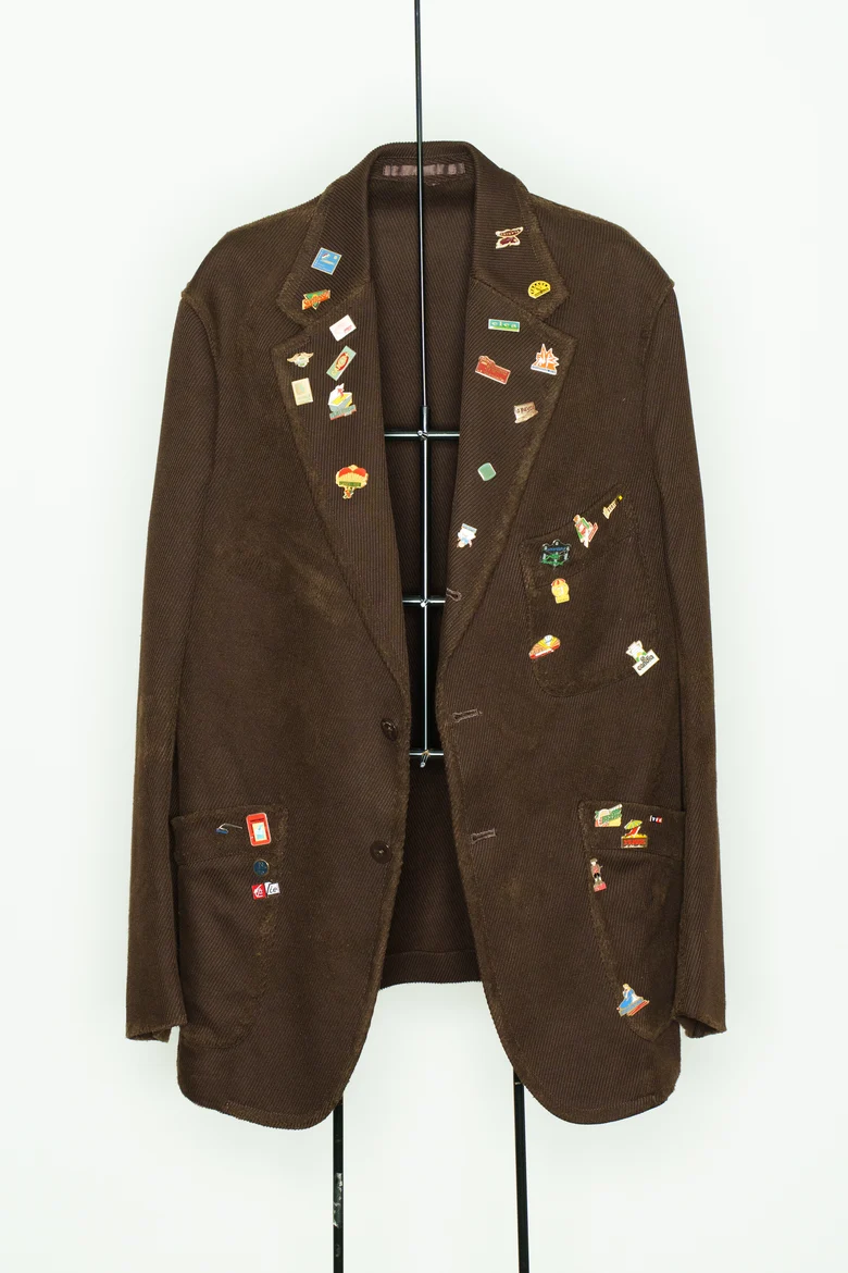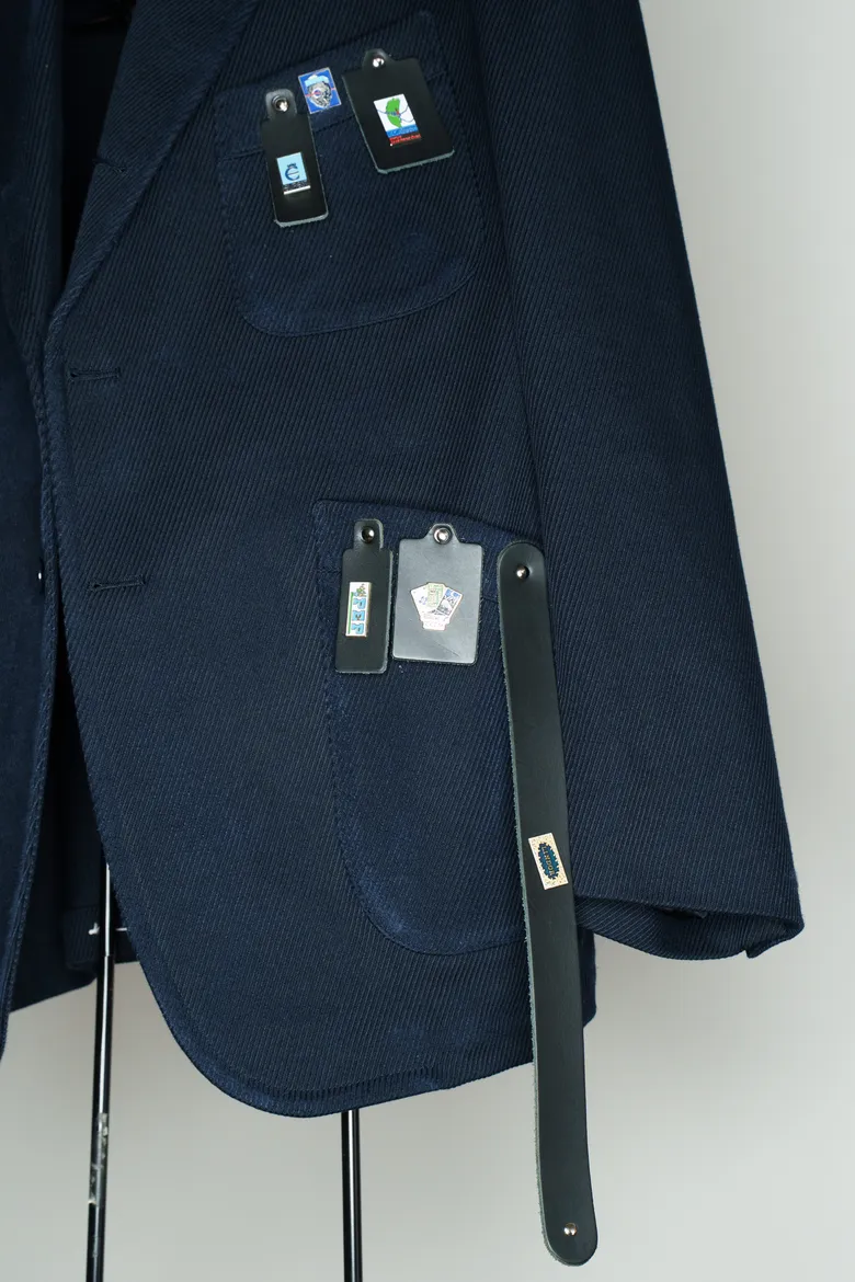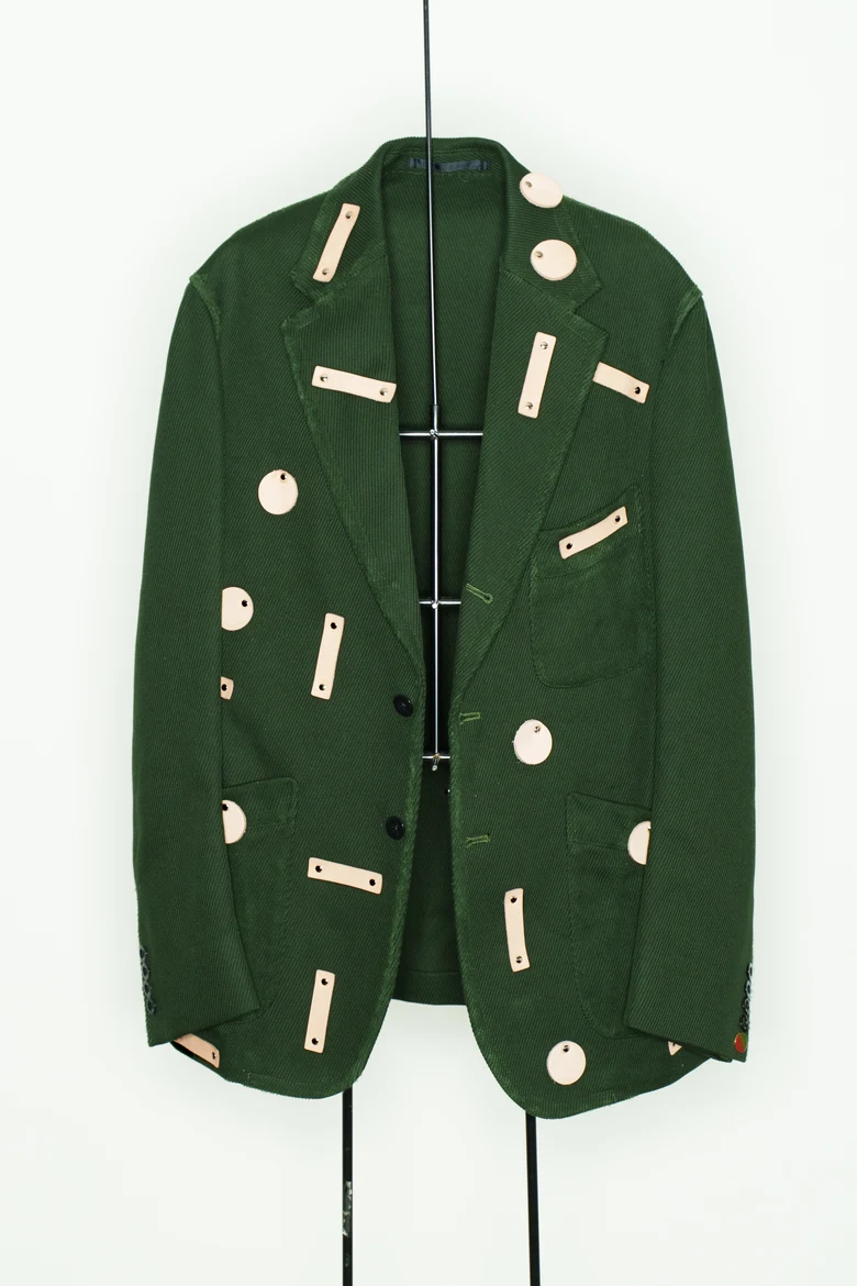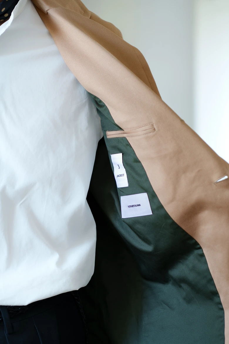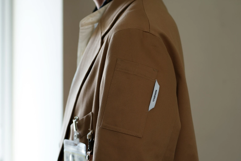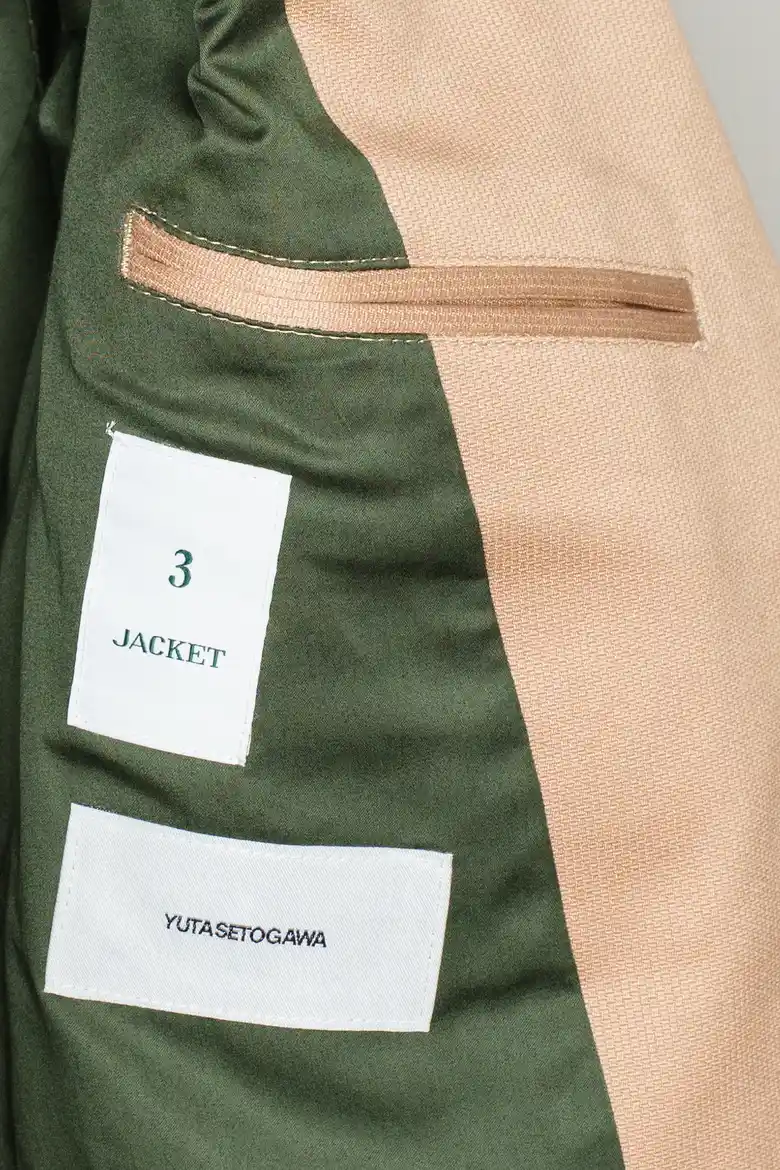 デッドストックのフランス製コットンピケを採用した“丸縫い”仕立ての限定4着。美しいグリーンの裏地やメタルボタンもデッドストックで、医療従事者の下げ札風パーツを胸ポケットにクリップ止めしたディテールが象徴的である。国内のベテランテーラーが一人で全工程を担い、長く愛用できる温かみを宿す。