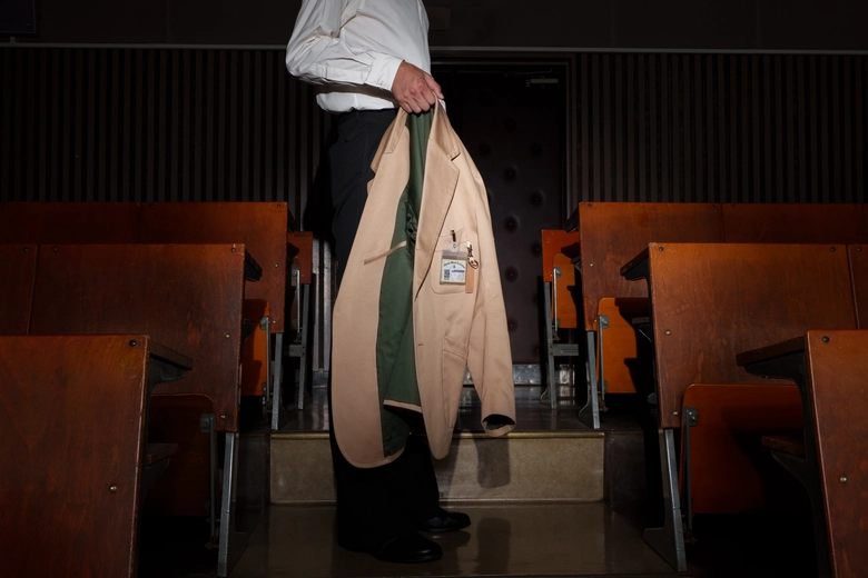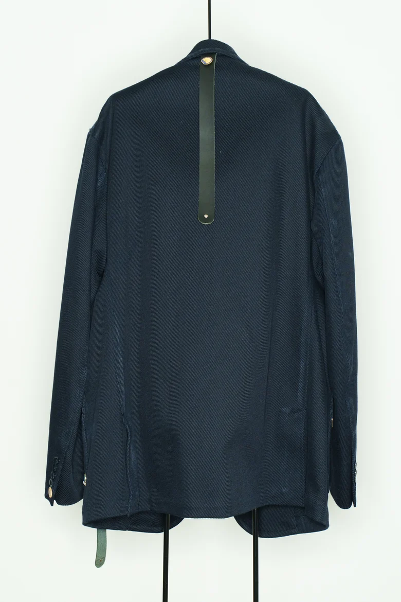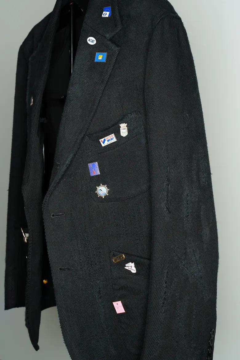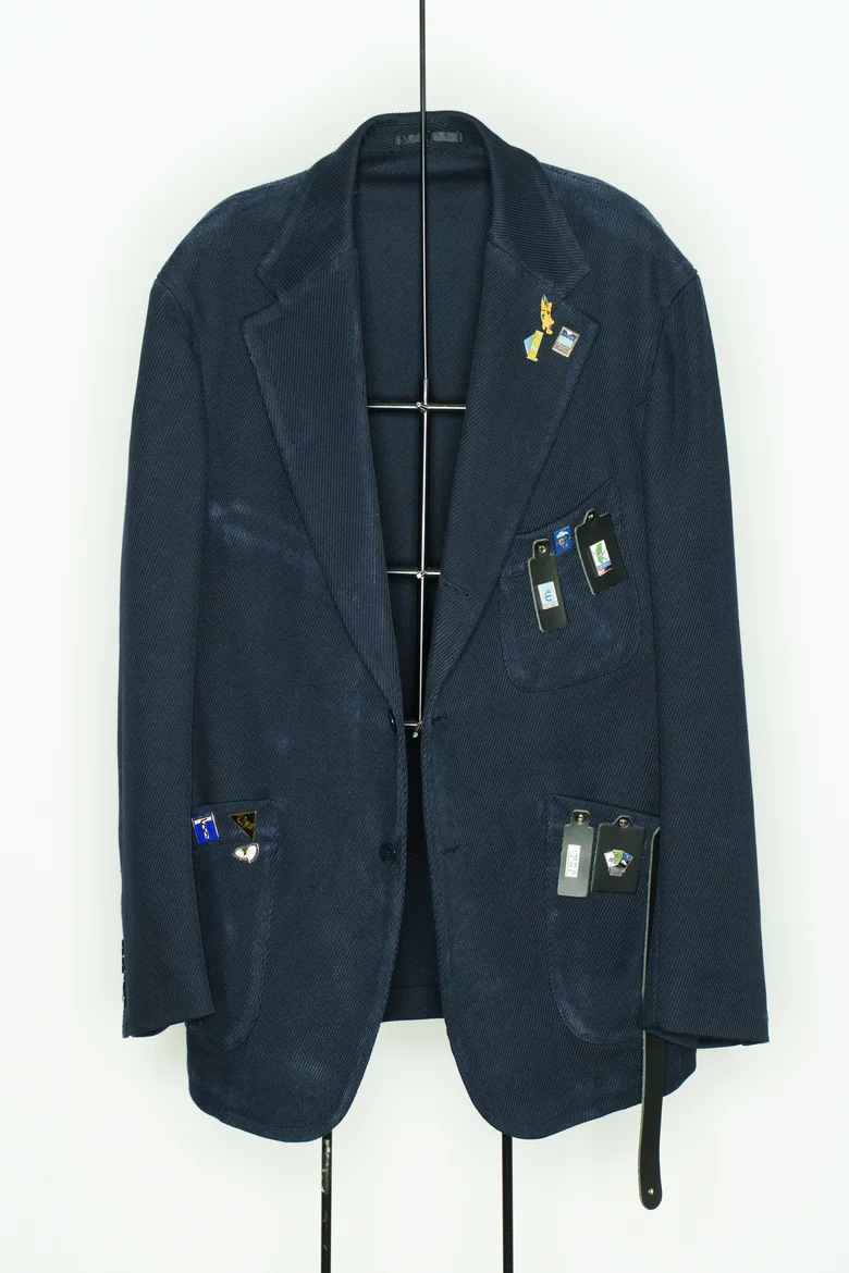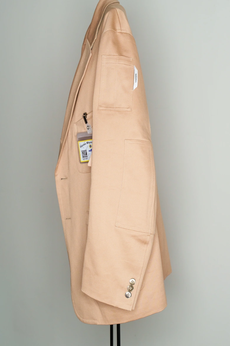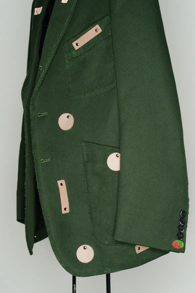 デッドストックのフランス製コットンピケを採用した“丸縫い”仕立ての限定4着。美しいグリーンの裏地やメタルボタンもデッドストックで、医療従事者の下げ札風パーツを胸ポケットにクリップ止めしたディテールが象徴的である。国内のベテランテーラーが一人で全工程を担い、長く愛用できる温かみを宿す。