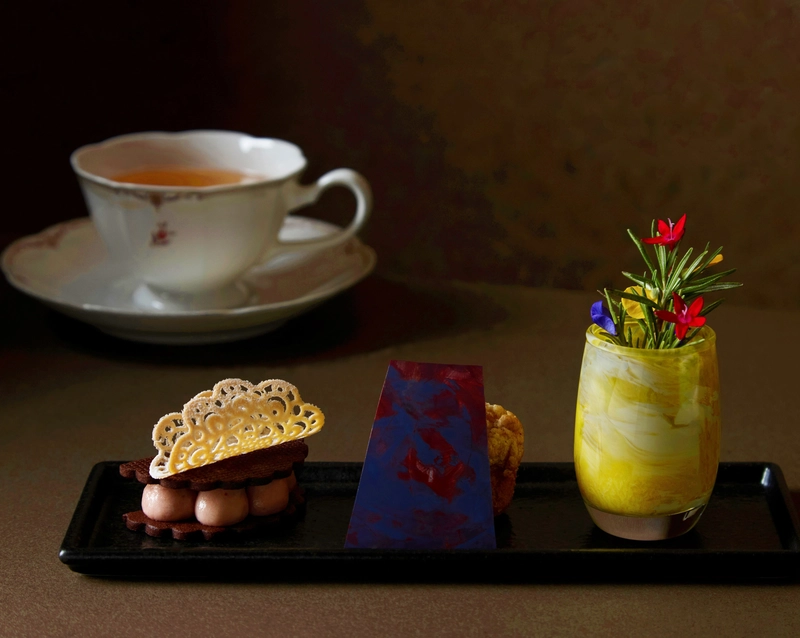 会期にあわせ、リーガロイヤルホテル大阪「メインラウンジ」では、所蔵作《周秋蘭立像》(1928)の世界観をスイーツで表現した「『小出楢󠄀重 新しき油絵』展 秋蘭ティータイムセット」を提供。
