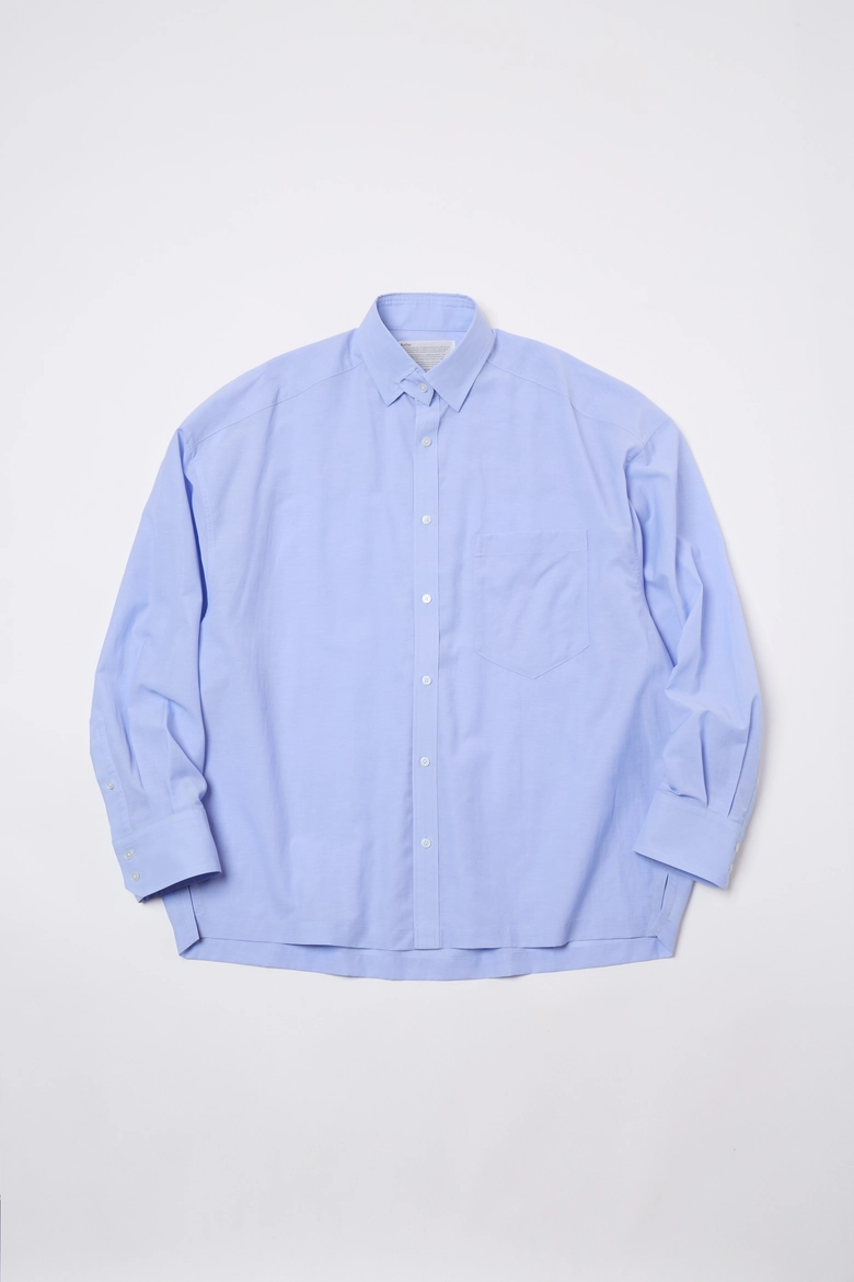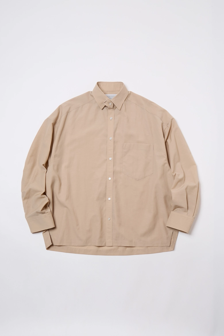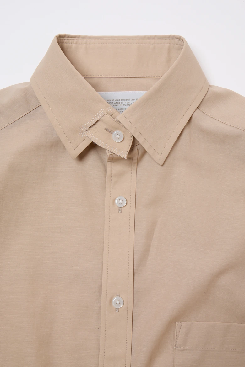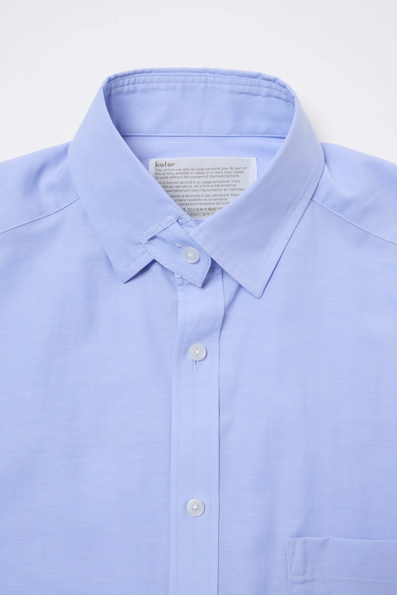 襟元には、台襟が上襟を貫通する独創的なディテールが施されている。シンプルなアイテムの一部に表情を添えたデザインが、kolorらしく端正さと遊び心を兼ね備えた一着となっている。