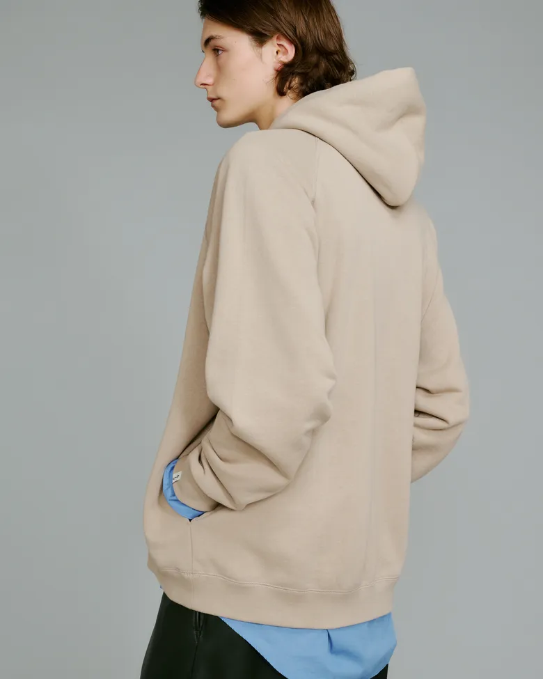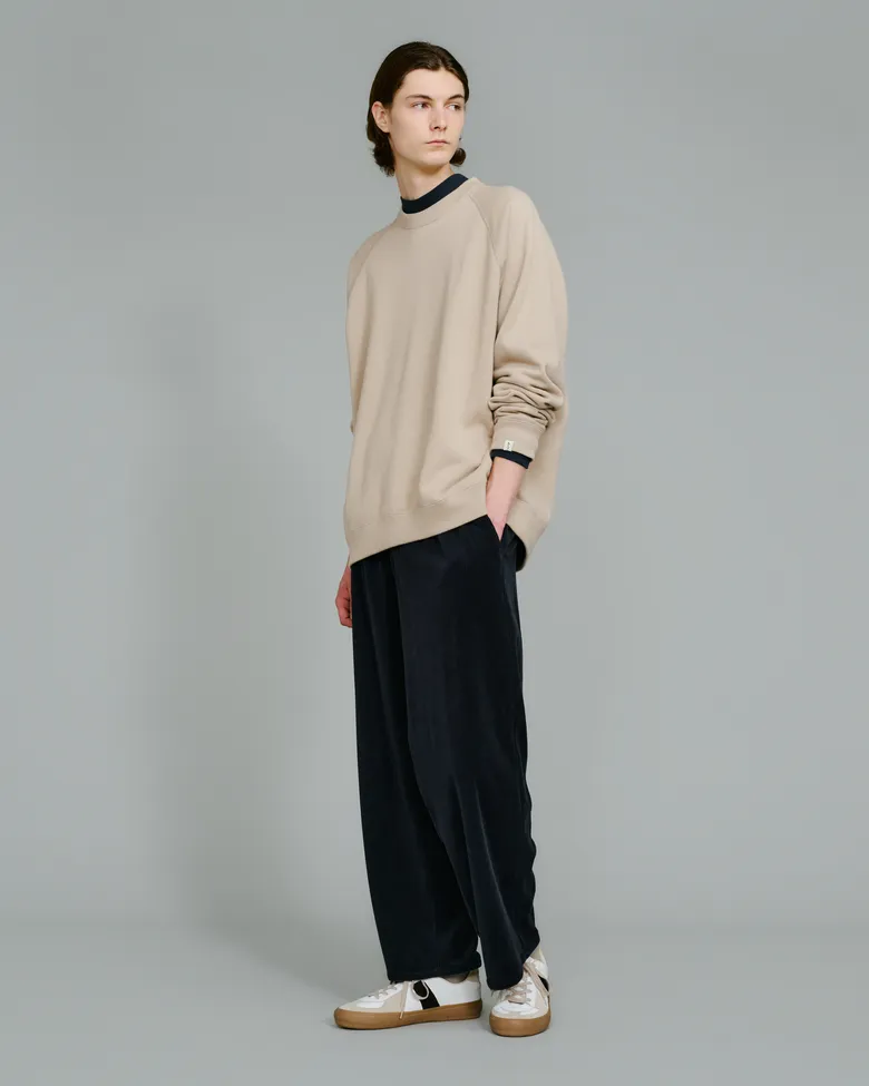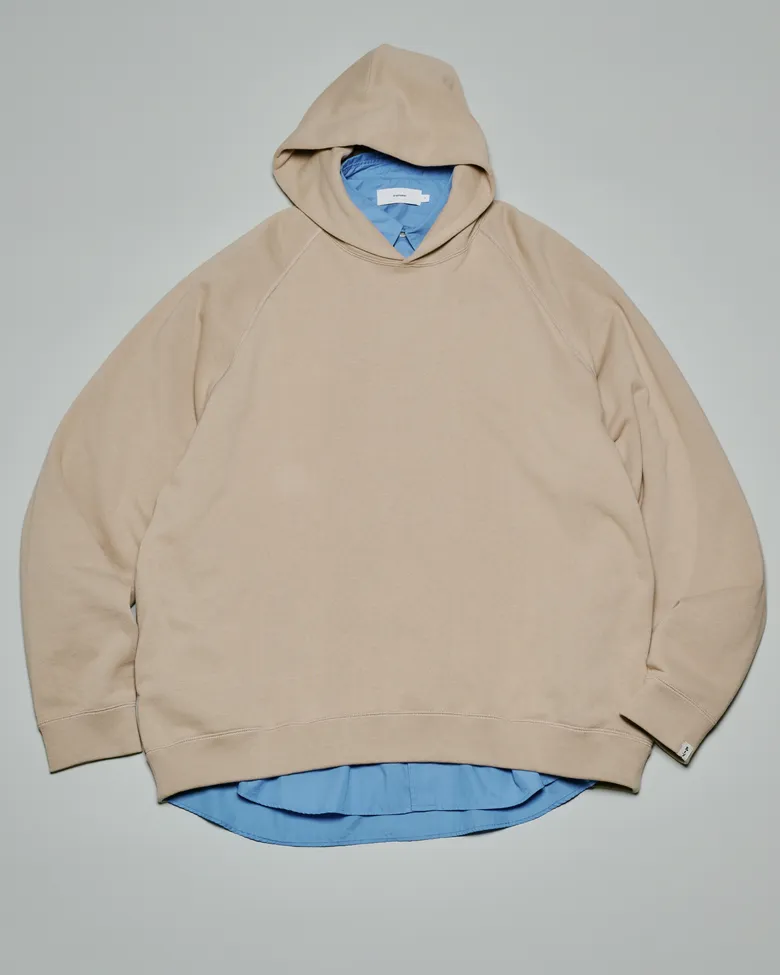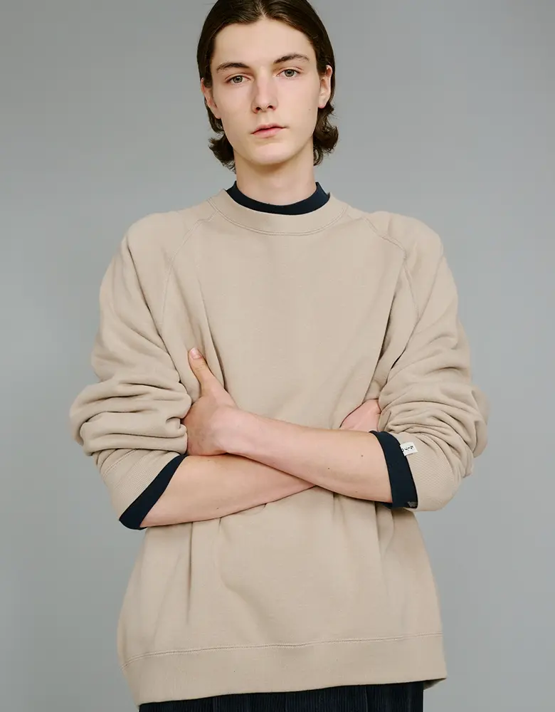 今回登場するのは、<Graphpaper>2025年秋冬シーズンのキーカラーである「グレージュ」を取り入れた「Raglan Sweat」と「Sweat Parka」。<LOOPWHEELER>の代名詞である吊り編み式織機から生み出されるふっくらとしたスウェット生地を採用し、<Graphpaper>らしい余白のあるシルエットに再構築した。アームホールや身幅にゆとりを持たせることで、素材の柔らかさを最大限に引き立てている。