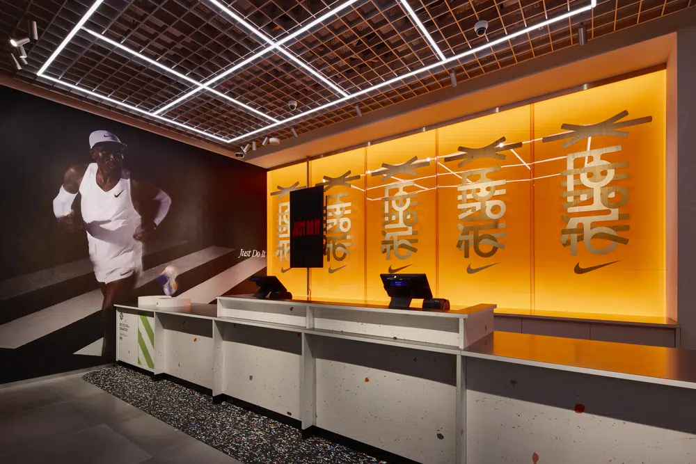 店舗はサステナビリティを重視し、什器や壁面に再生素材を使用。1階には原宿・表参道を象徴する欅を使った新ロゴを設置し、各階のエレベーターホールには日本の伝統工芸「組子細工」で作られたスウッシュロゴを配している。