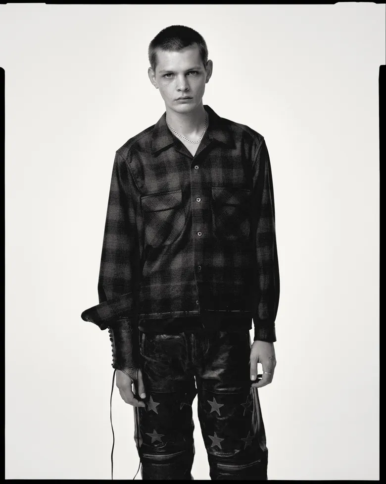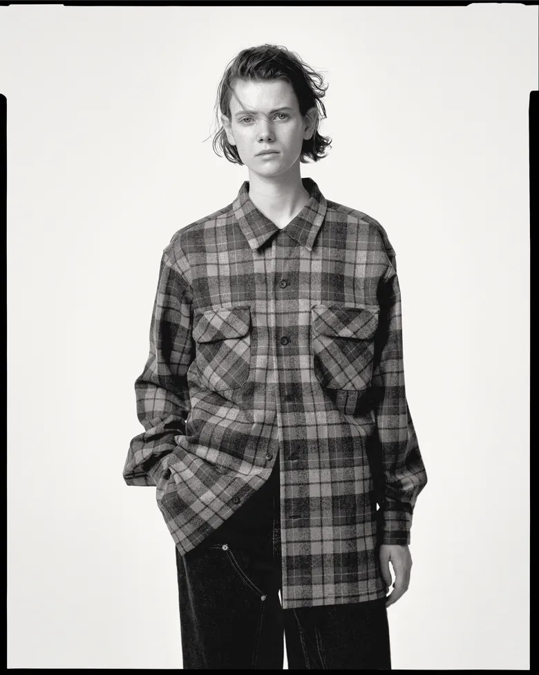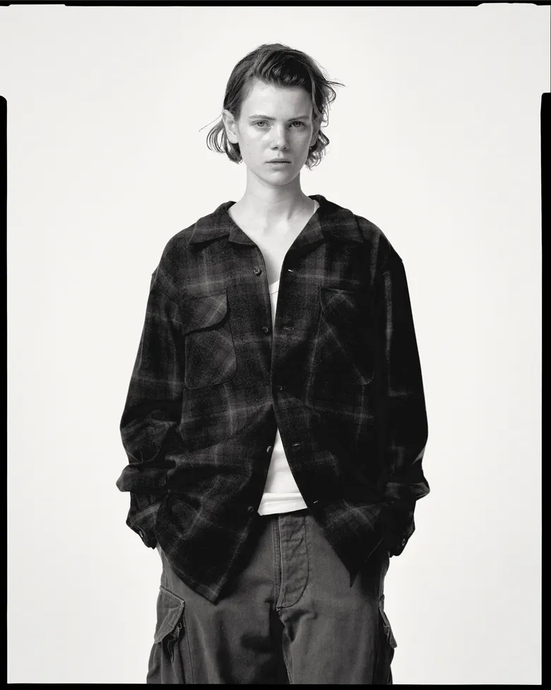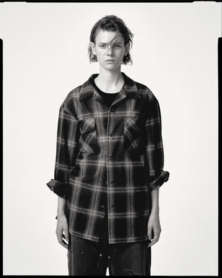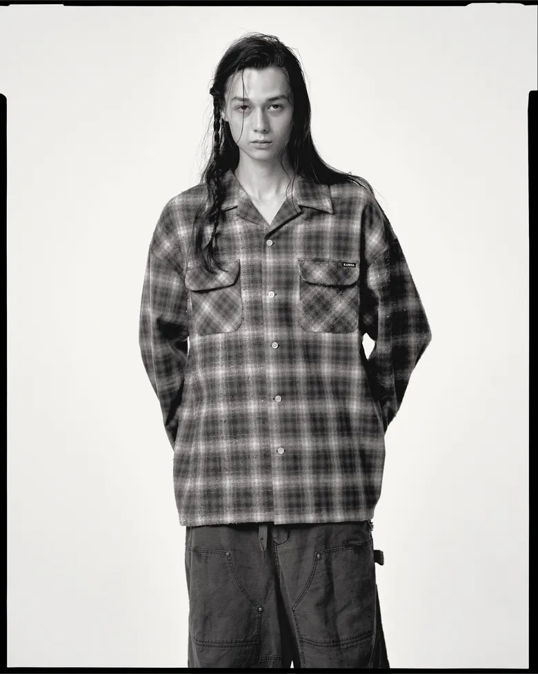 ピュアバージンウールを使用したペンドルトン US 製チェック生地のオープンカラーシャツ。プレーンと、パンチング加工をすることで生地に毛足の長いネップ感を施し着古した表情に変えた 2 種類の同柄生地を使用することでクレイジーパターンに仕上げたデザイン。両胸にフラップポケット、左ポケットフラップに KAMIYA ロゴのピスネームを叩きつけ、首裏にペンドルトンヴィンテージネームと KAMIYA ネームをダブル使いした意匠。ドロップショルダー、身幅にゆとりのあるボックスシルエット。KAMIYA とのコラボレーションアイテム。¥82,500