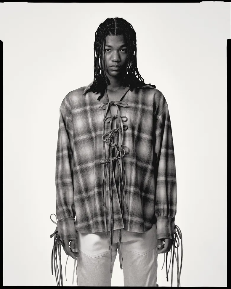 ピュアバージンウールを使用したペンドルトン US 製チェック生地のプルオーバー型ストリングシャツ。前立て・袖口に複数のストリングス使いをしたことで、着用時に立体感と躍動感を感じさせる。身頃のフロント、バックで着丈の設計を変えたことでアシンメトリーに仕上げられたデザイン。首裏にペンドルトンヴィンテージネームと SUGARHILL ネームをダブル使いした意匠。ドロップショルダー、身幅にゆとりのあるシルエット。SUGARHILL とのコラボレーションアイテム。¥93,500