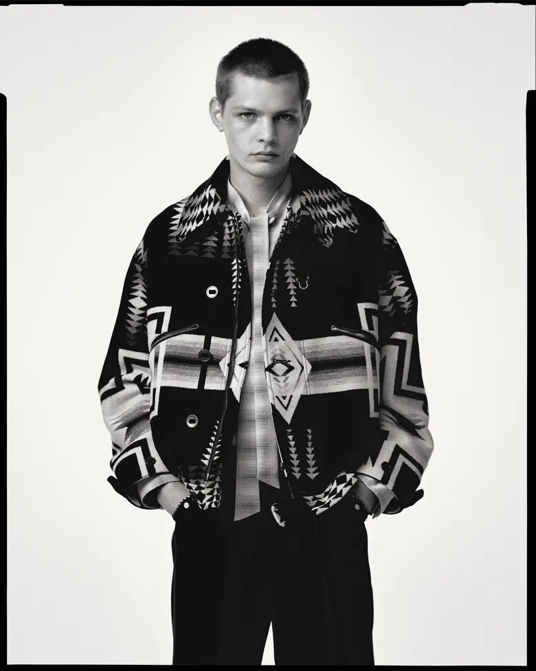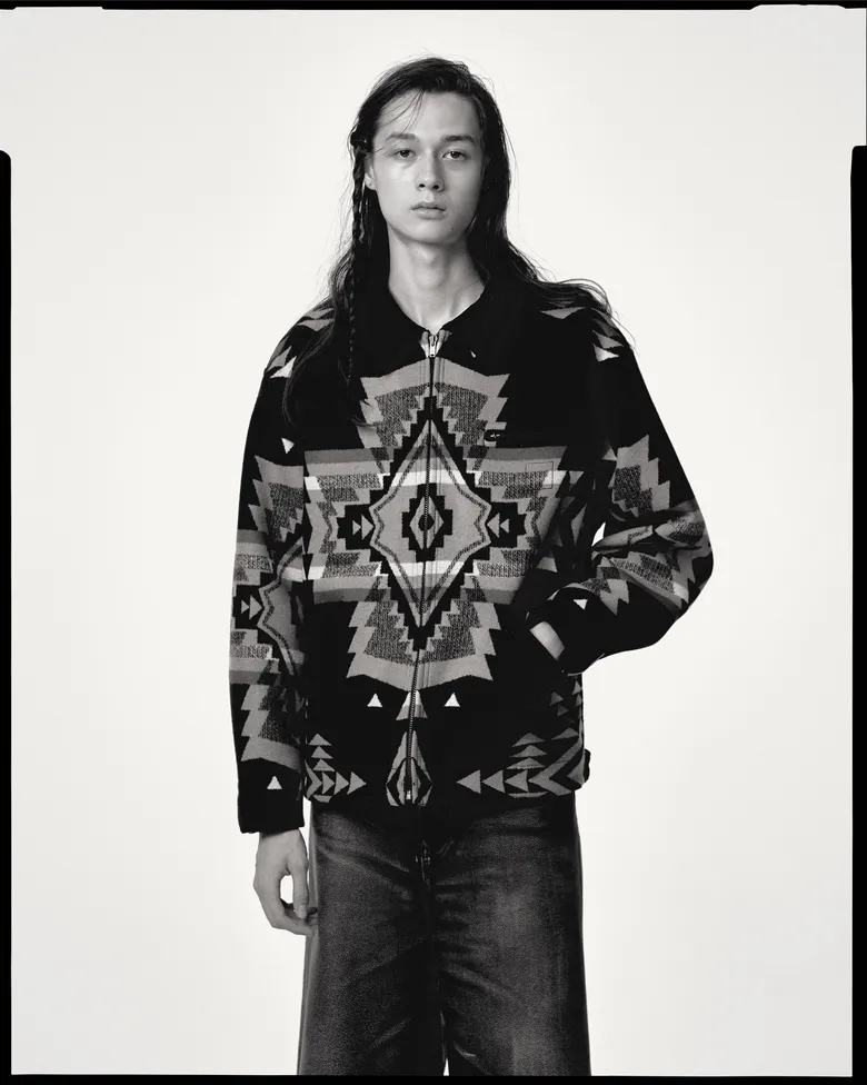 ジャガード織りで表現したブランケットウェイトのウール素材を使用したフライトジャケット。ネイティブ柄に合わせてディテールをアップデート。フロントは比翼仕立て、左胸のストラップには変形 D リングを付属、襟は立ち上げてチンストラップで留めることが可能、裾は L 型に仕上げたボタン留め仕様、両脇にスラッシュポケットを配置、とデザイン性の高さを象徴した 1 着。身幅にゆとりのあるシルエット。DAIRIKU とのコラボレーションアイテム。¥165,000