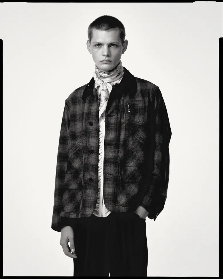 ピュアバージンウールを使用したペンドルトン US 製チェック生地のハンティングジャケット。左胸にファスナー付きパッチポケット、両腰には斜め配置した D 型スラッシュポケット・大振りなフラップポケットをレイヤードさせたテクニカルなデザイン。両肘にはエルボーパッチ、襟内側にチンストラップ用フラップ、ヴィンテージカバーオールに見られるカフ形状など、DAIRIKU の持つヘリテージ感を詰め込んだ意匠。身幅にゆとりのあるシルエット。DAIRIKU とのコラボレーションアイテム。¥121,000
