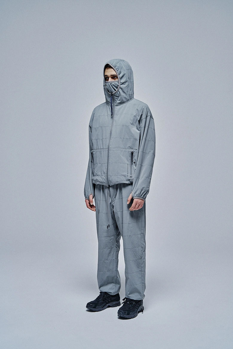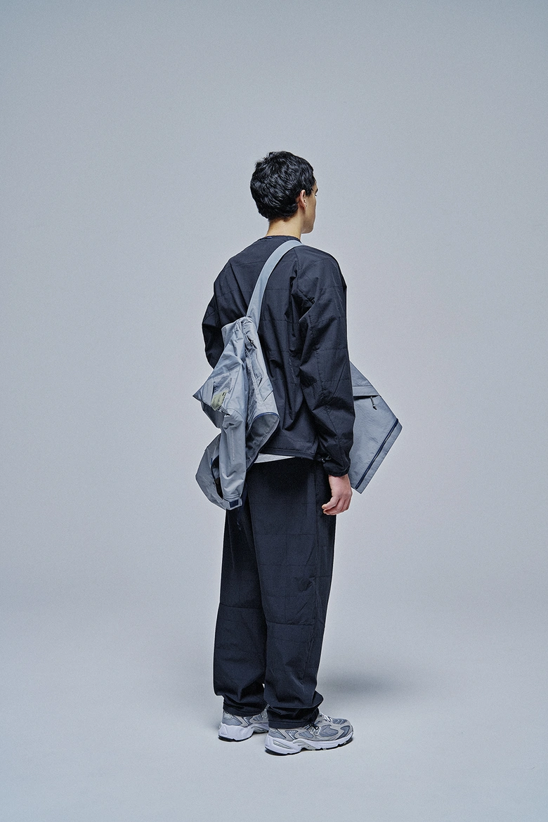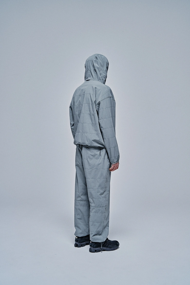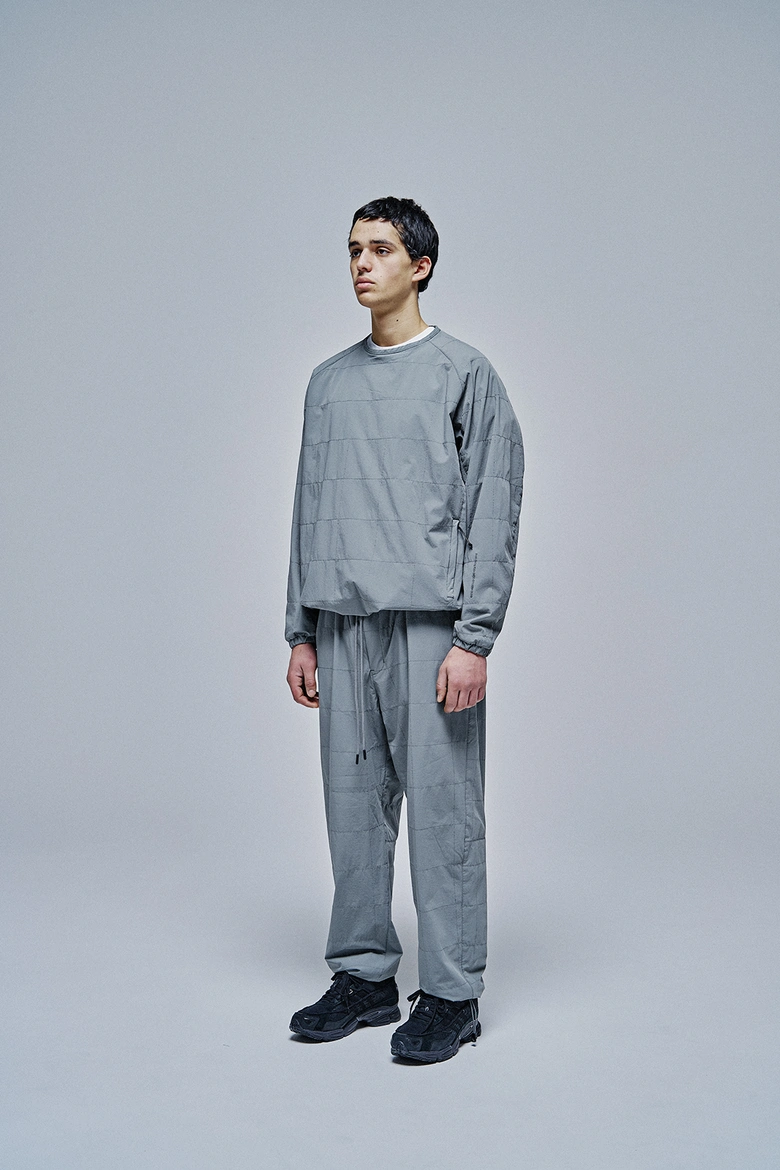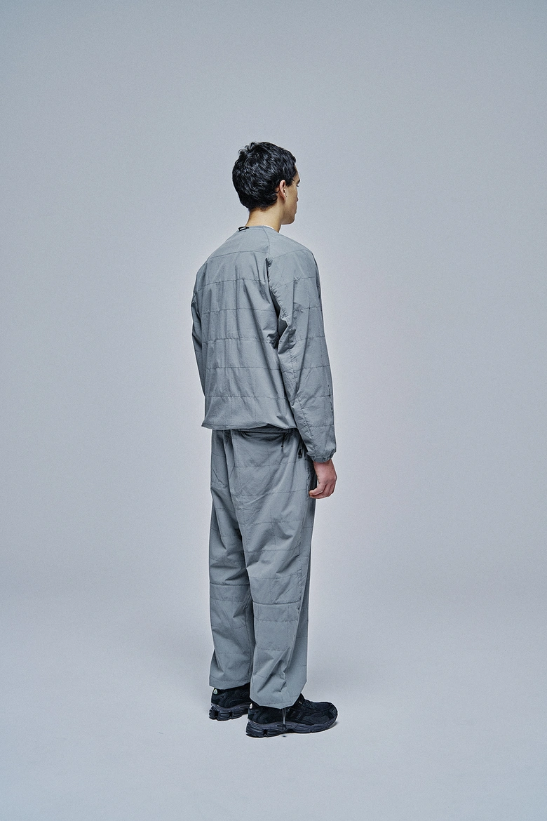撥水性に優れたCORDURA FabricとPOLARTECのキルティング生地を使用したトラックパンツ。身頃全体にグリッド状にステッチを走らせたデザイン。両脇にスラッシュポケット、背面左右にファスナーポケット、ウエスト・両裾にスピンドルが付属しシルエット調整が可能。同生地を使用したプルオーバー、フーデッドジャケットとセットアップでの着用が可能。2色・4サイズ展開。WILD THINGSとのチームアップモデル。