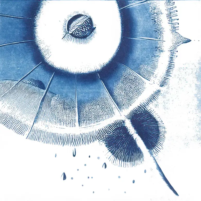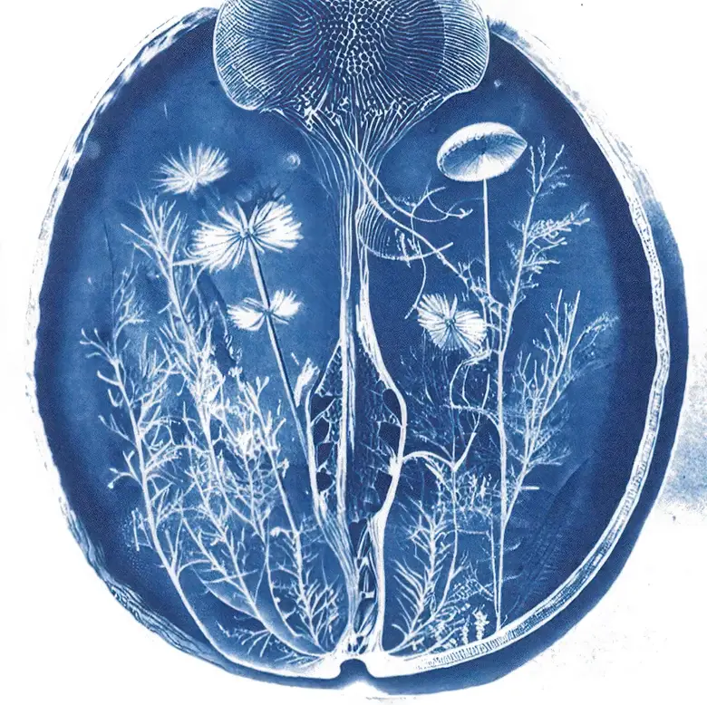 制作過程では、デジタルで生成したイメージを一度アナログ出力し、再びデータ化するという独特のプロセスをとる。サイアノタイプ(青写真)を用いた表現は、19世紀の植物学者で写真家のアンナ アトキンスに影響を受けたもの。自然の観測と記録がクラウド上の情報にまで広がった現在を映し出す。