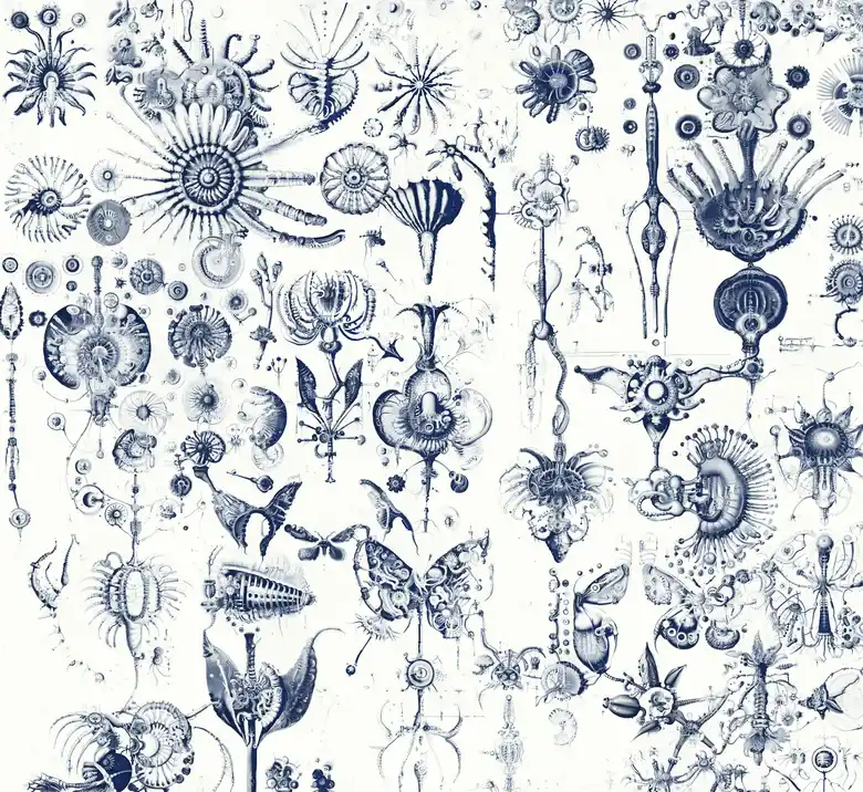 そこに立ち現れるのは、解読不能な記述や歪んだ姿をもつ“存在しない生命”たち。分類や体系化によって自然を理解しようとしてきた科学の枠組みを揺さぶりながら、自然界にはいまだ無数の未知と多様性が広がっていることを示している。AIを介して生み出されるこれらの像は、人間とAIの想像力が交差することで開かれるもうひとつの自然史を思わせる。
