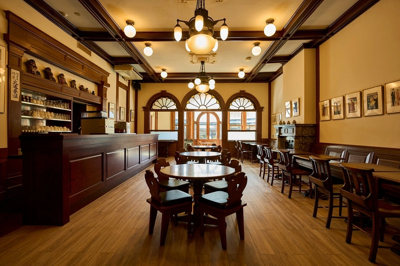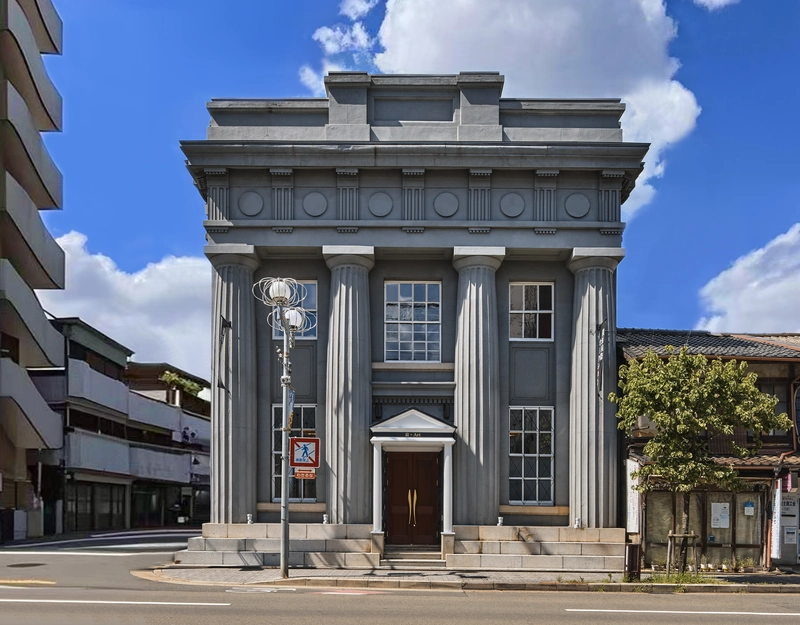 明治のたばこ王・村井吉兵衛が創業した村井銀⾏七条⽀店として1914年に建築された煉⽡造2階建ての建物。ギリシャ神殿を思わせるデザインで、ドリス式の円柱やその上の梁が建物の⼤きさに⽐して太く、より重厚な雰囲気が漂っています。内部には、⾦庫室やその扉、上部のペディメント、階段などにオリジナルの意匠が遺されています。