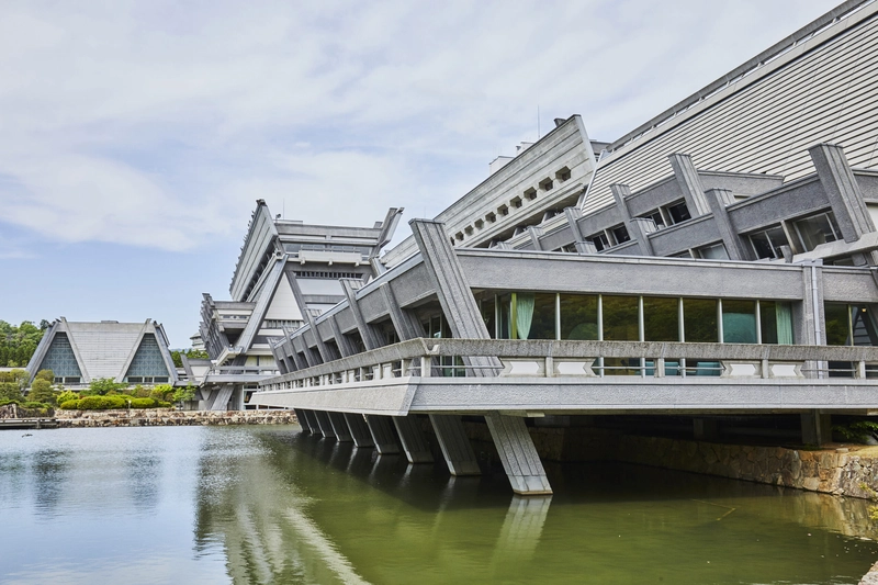 1966年竣⼯の国⽴京都国際会館は、⽇本の戦後建築を代表する⽇本初の国⽴の国際会議場です。設計を担ったのは建築家・⼤⾕幸夫。台形・逆台形の空間の組み合わせで形づくられ、合掌造りか神社の社殿を彷彿とさせるような⽇本の伝統様式をモチーフとした独創的な造形。⽐叡⼭を背景にした宝ヶ池にまるで宇宙船のようにそびえる異貌の⼤建築です。