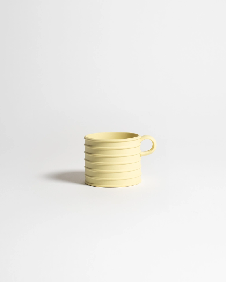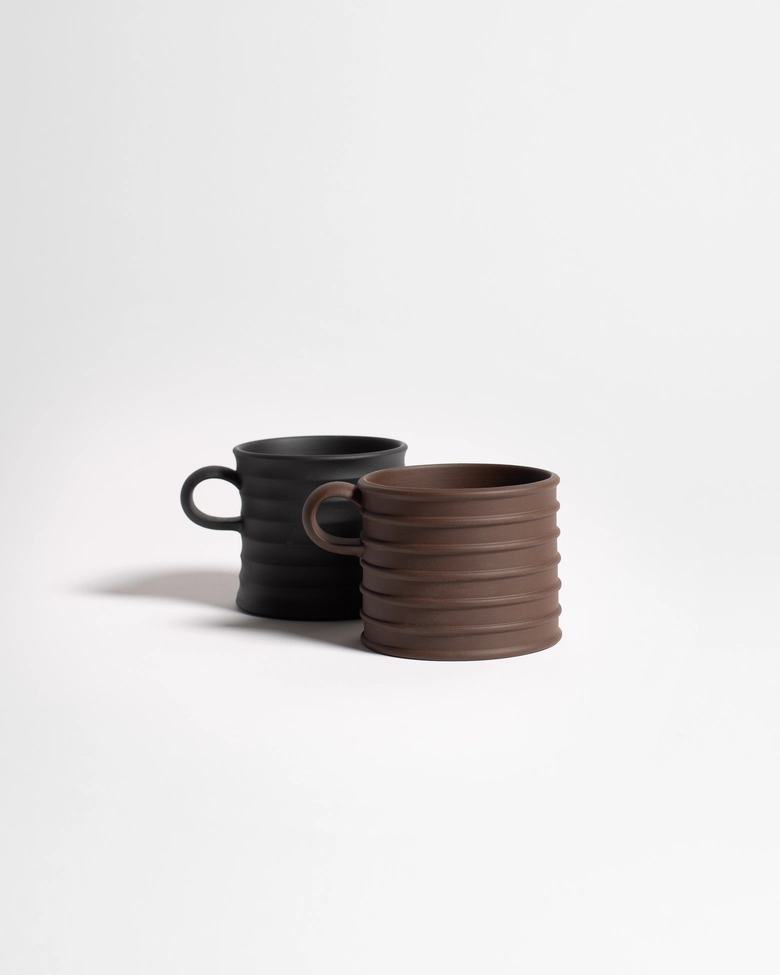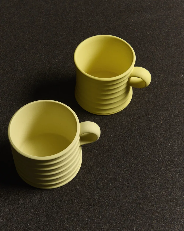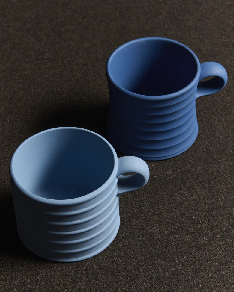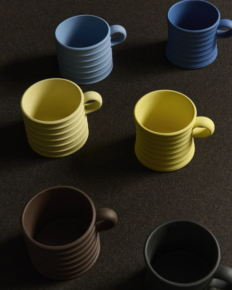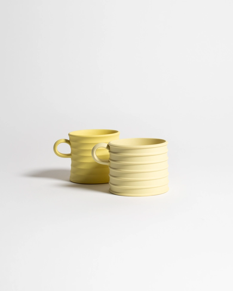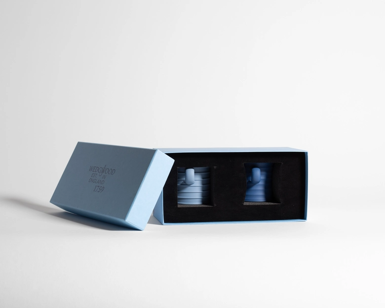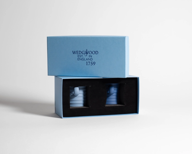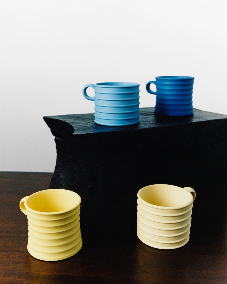 <Wedgwood>の卓越したクラフトマンシップは、今回のプロダクトにも色濃く反映されている。とりわけマグの成形においては「ターニング」と呼ばれる技法が用いられ、機械と職人の技が融合した緻密な手仕事が施されている。リブ模様もすべて手作業によって仕上げられ、ルーシー・リーが自身の作品に込めた精神と共鳴する仕上がりとなっている。