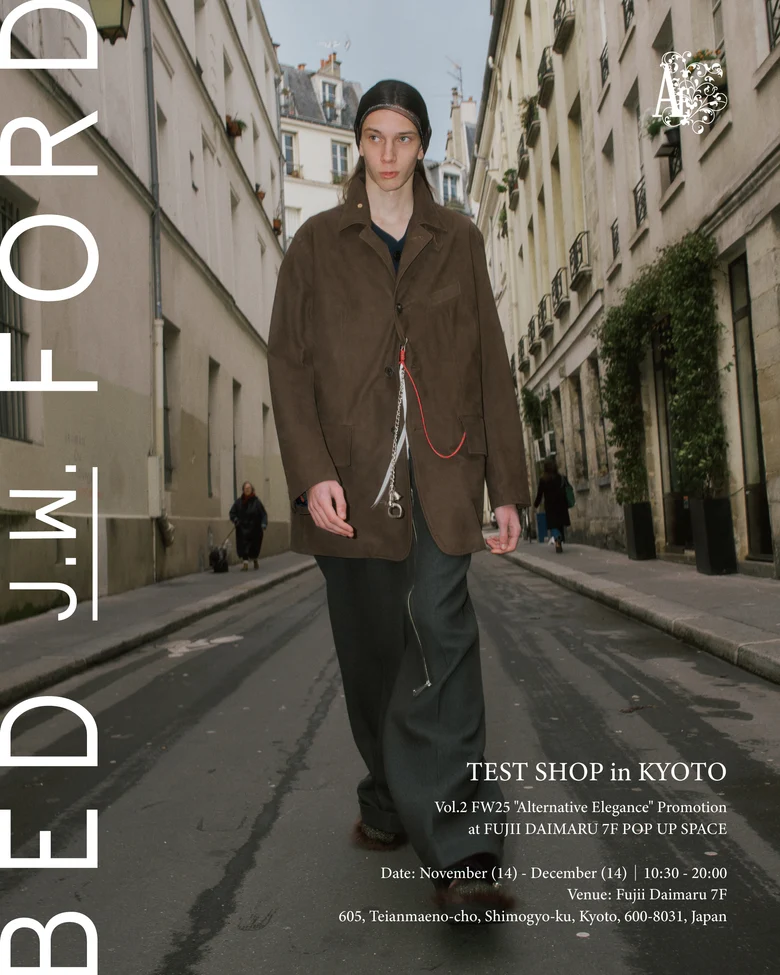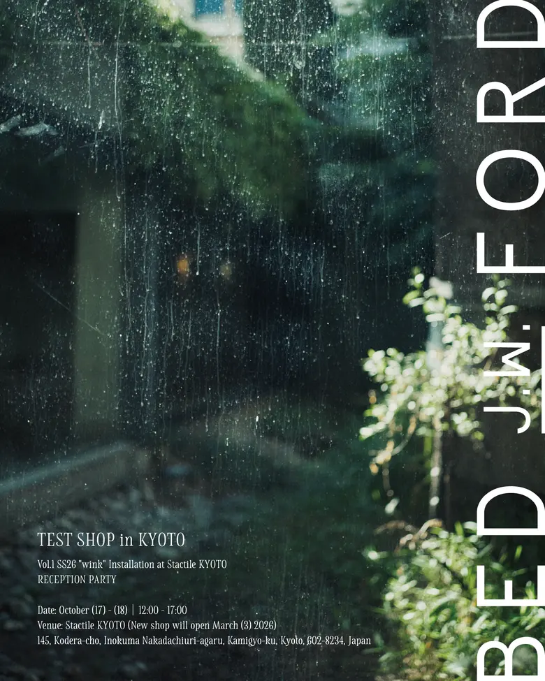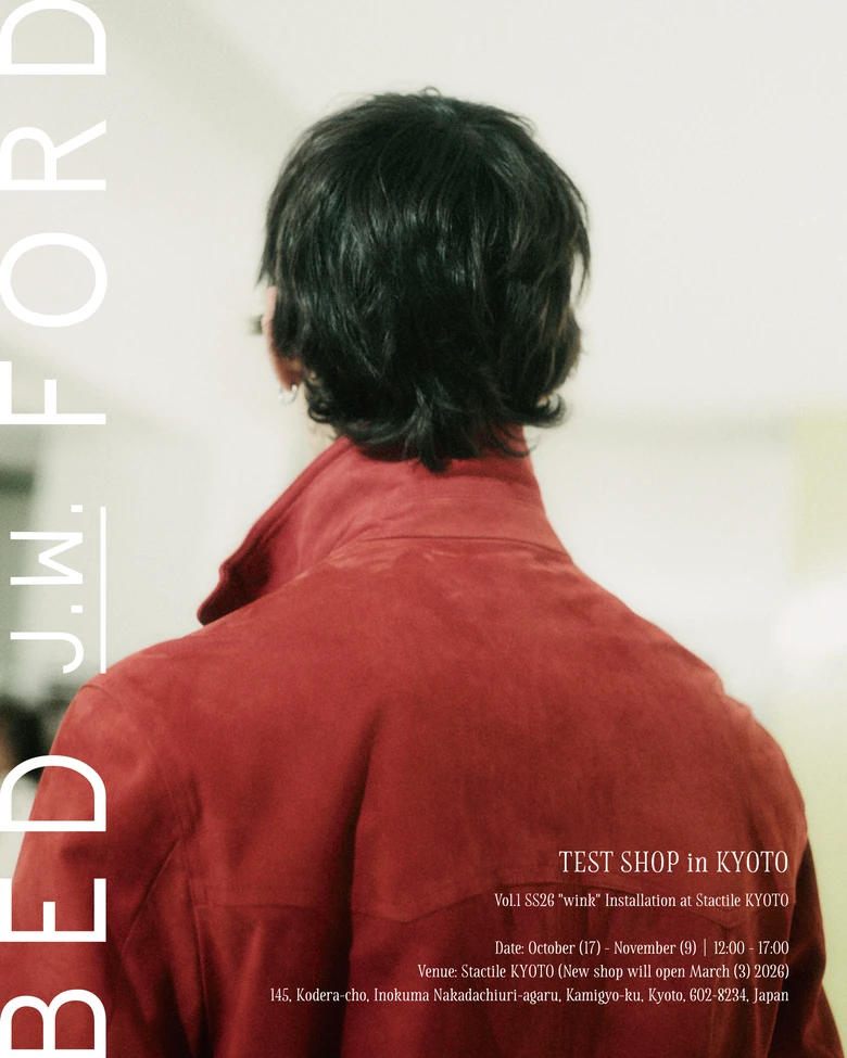 今回の「TEST SHOP」は、京都の伝統的な街並みに溶け込む歴史的建築を舞台に、“服の原点である糸を見つめ直す”という<BED j.w. FORD>の思想を体現する場となる。西陣織工場跡の約200平米の空間を活用し、変わりゆく時代の中で「変わらない日常の大切さ」をテーマにしたコレクションを、儚くも美しいインスタレーション形式で展開。建築と服、そして人の想いが共鳴する特別な時間を提供する。
