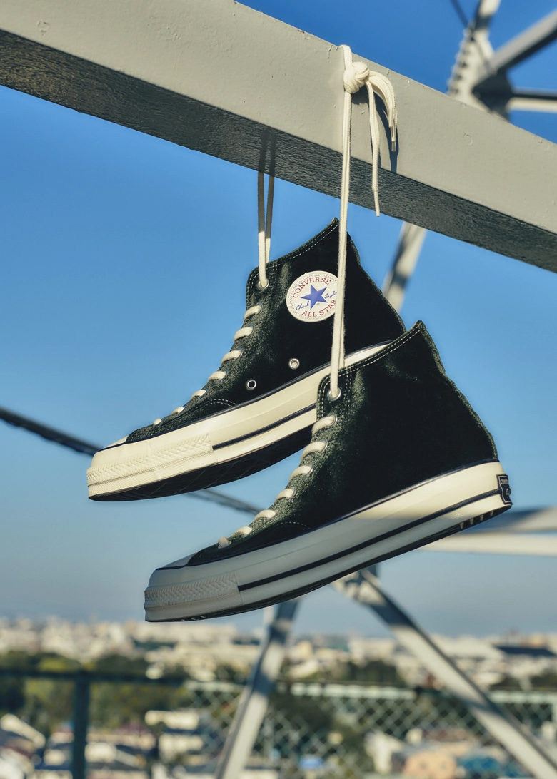 本モデルは、アーカイブのデザインと現代のスペックを融合させた<ALL STAR LGCY>をベースに、アッパーに深みのあるグリーンのベルベット素材を採用。クラシックなシルエットにラグジュアリーな素材感をプラスし、フォーマルにもロックにも合わせられる汎用性の高さを持つ。見る角度や光の加減によって表情を変えるベルベット特有の風合いが、他にはない特別感を演出する。