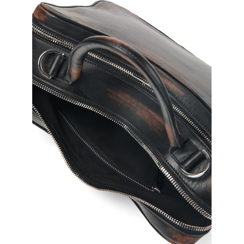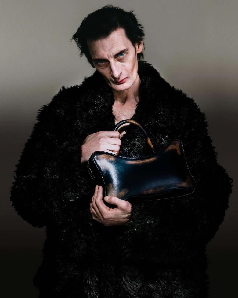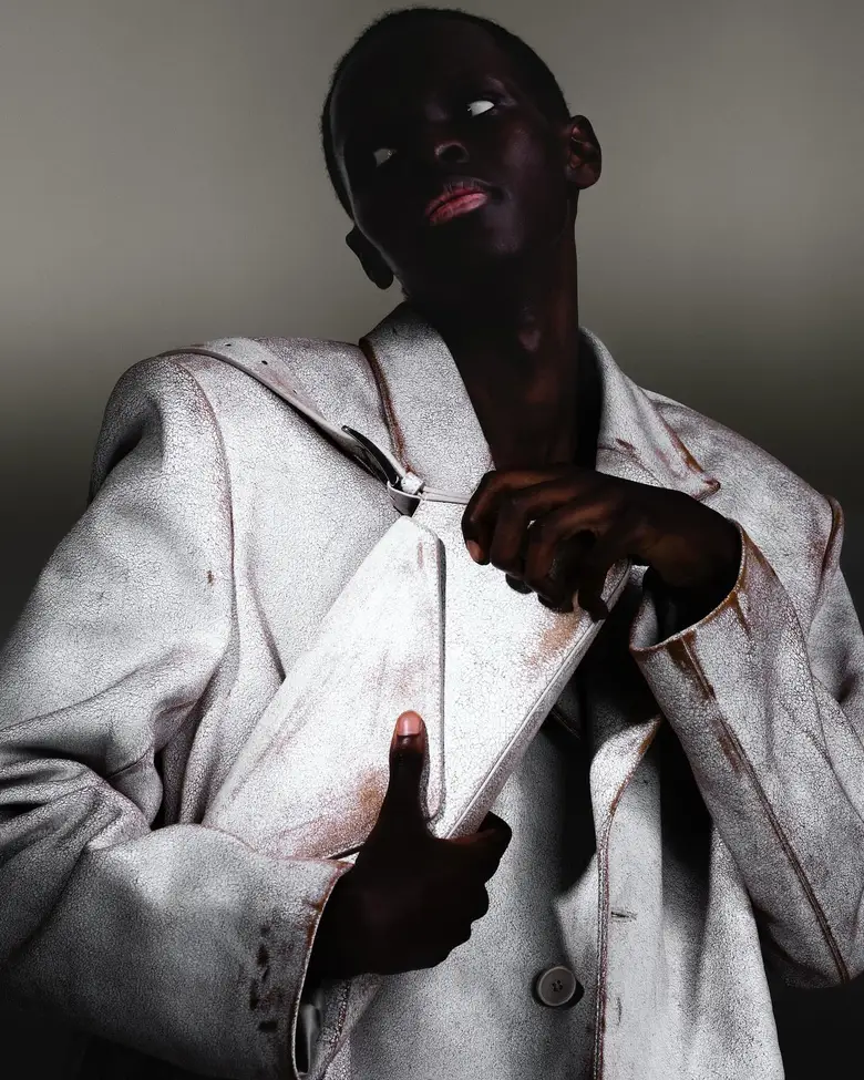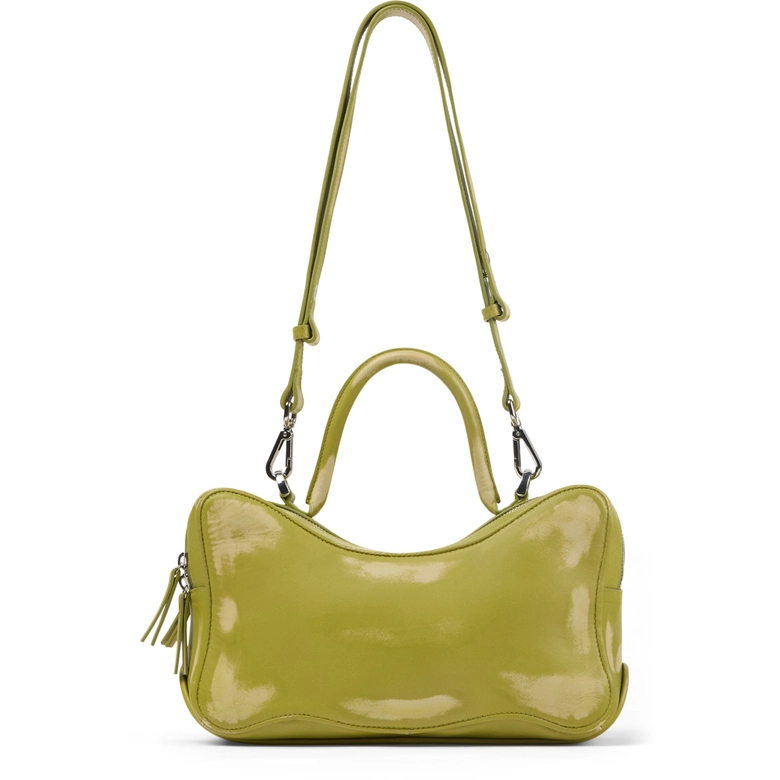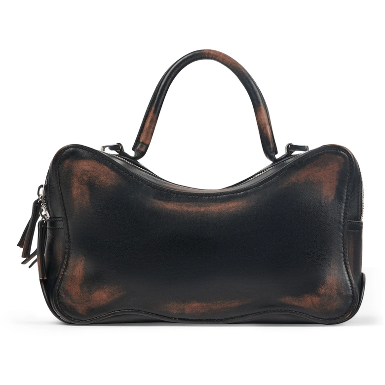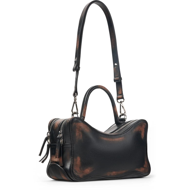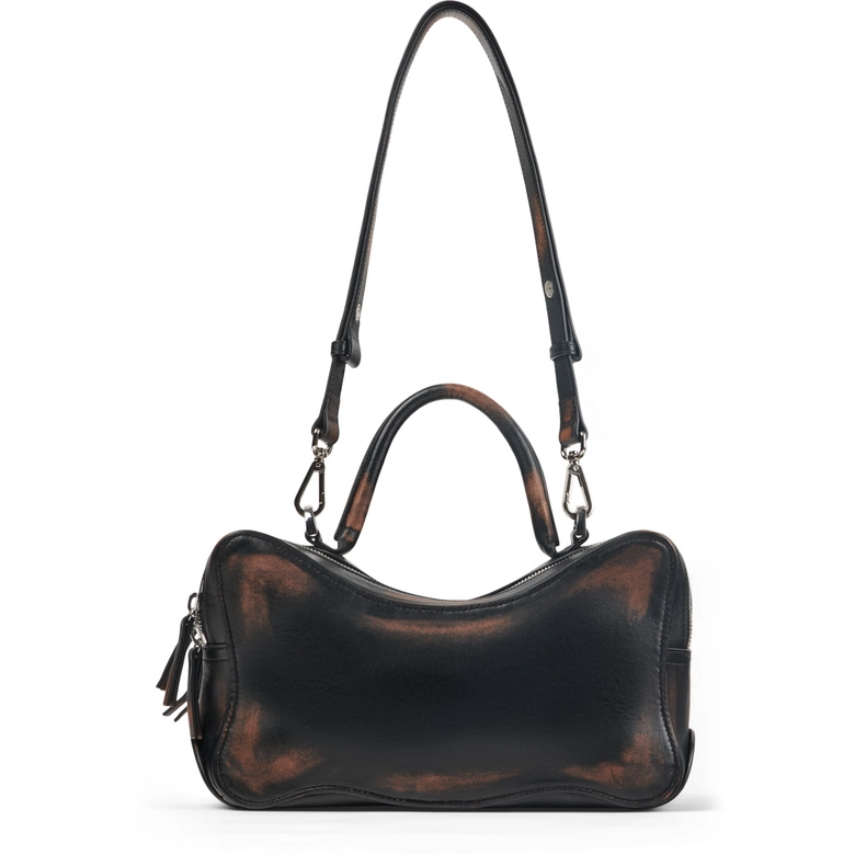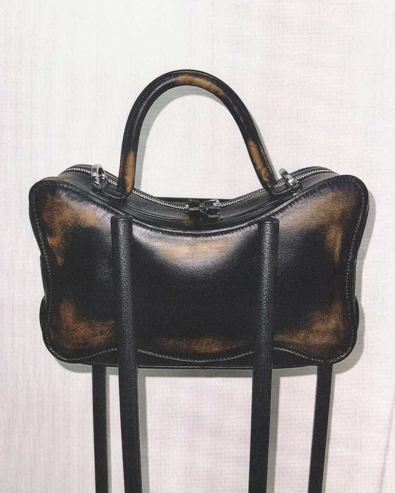 フィンランド語で「ランチ」を意味する名が付いたトップハンドルバッグ。ブラックとピスタチオグリーンの2色展開で、柔らかく歪んだ立方体のフォルムに、ハンドブラッシュで仕上げたレザーを採用。パイピングで縁取られた構築的なデザインと、表面に施された擦れ加工が特徴的で、ひとつひとつ異なる仕上がりを楽しめる。モノトーンのレディ・トゥ・ウェアや、ダメージ加工のアイテムと好相性。
