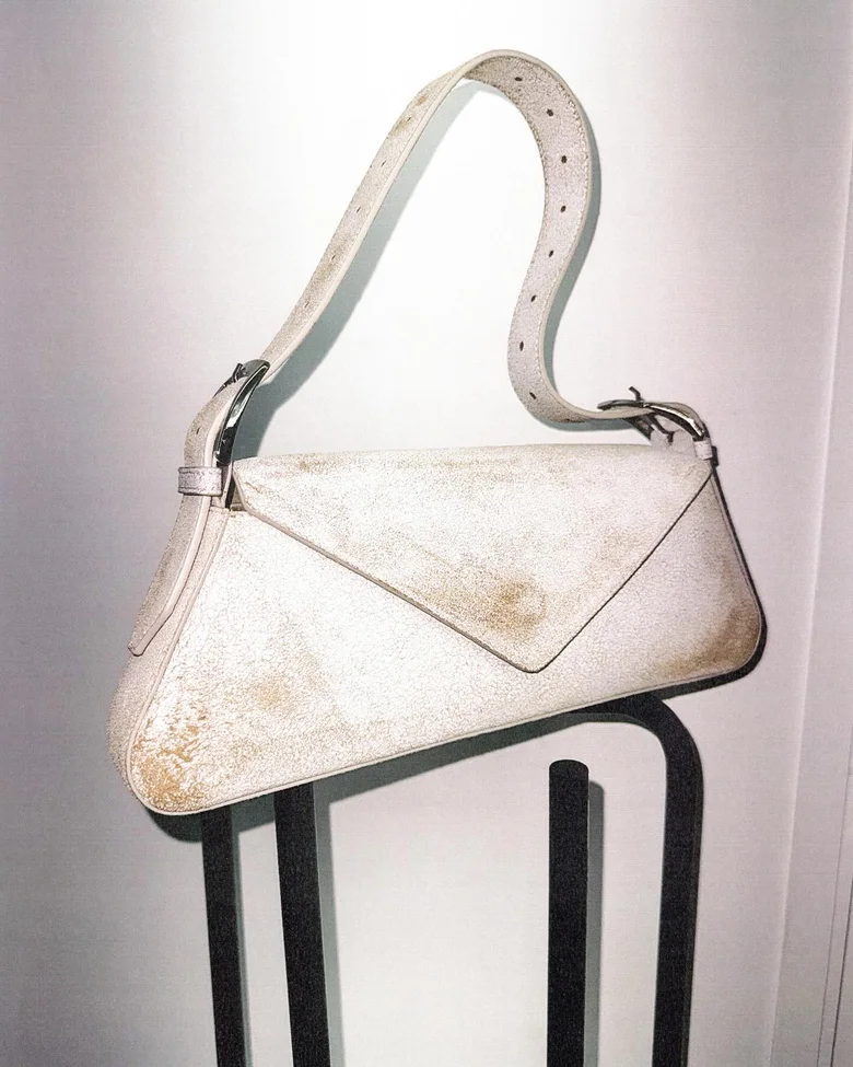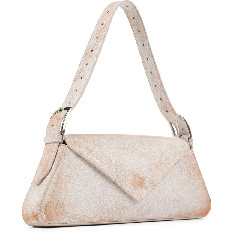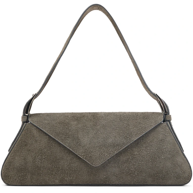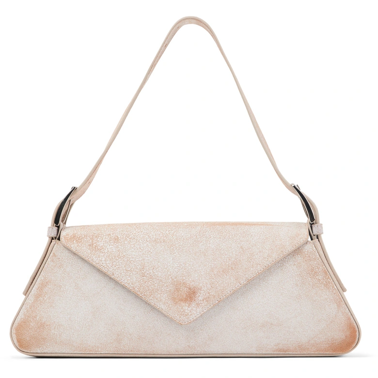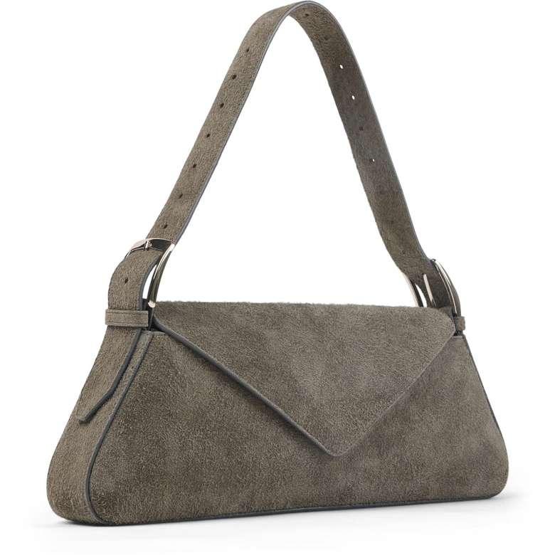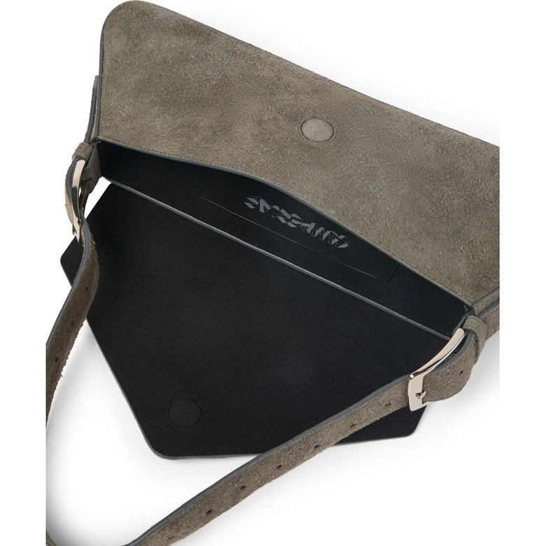 フィンランド語で「手紙」を意味するKirjeは、封筒を思わせる幾何学的なシェイプが印象的。角ばったフォルムにバックル付きショルダーストラップをあしらい、機能性とモダンな美しさを兼ね備える。スエード素材にダメージ加工を施し、ユニークな質感をプラス。