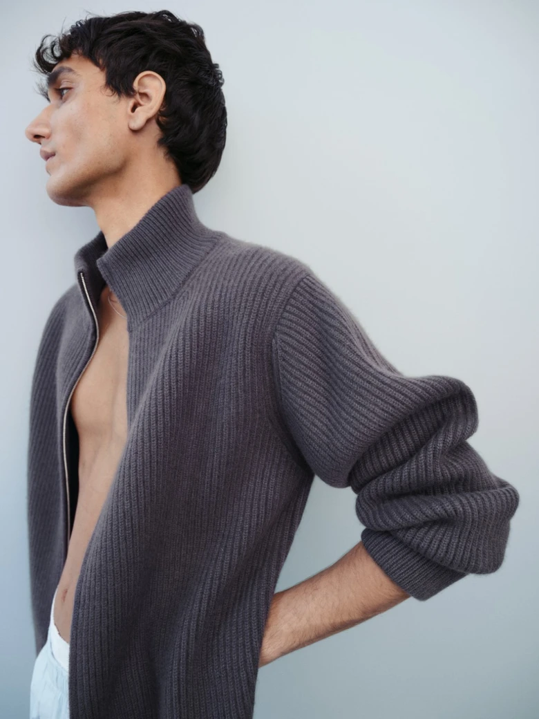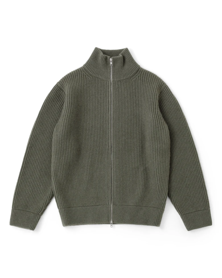 メンズ定番の「“あの”ドライバーズニット」を、繊維が長く丈夫なカシミヤ100%で。丸みあるシルエット、ダブルジップでニュアンスを調整しながら着用できるアイテム。
