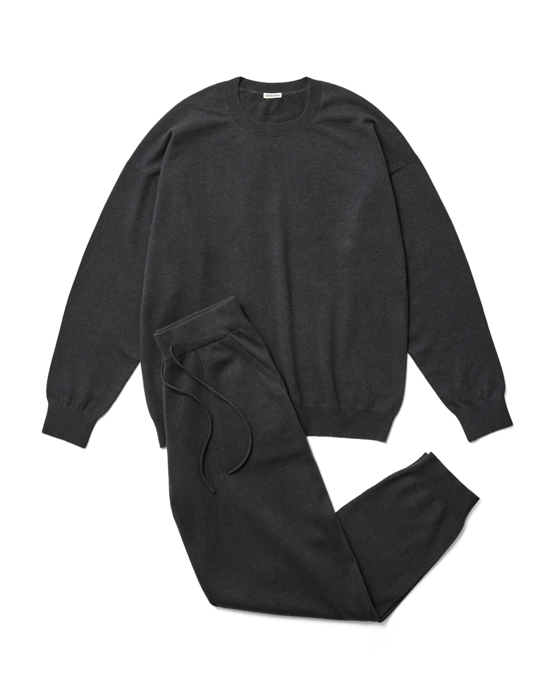 このシリーズを象徴する、まるでスウェットのようなクルーネックとリブパンツのセットアップ。トップスはドロップショルダーで、程よくゆったりとしたシルエットのクルーネック。パンツもリラックスしたフィット感ながら、ルーズな印象を与えないシルエットになっている。