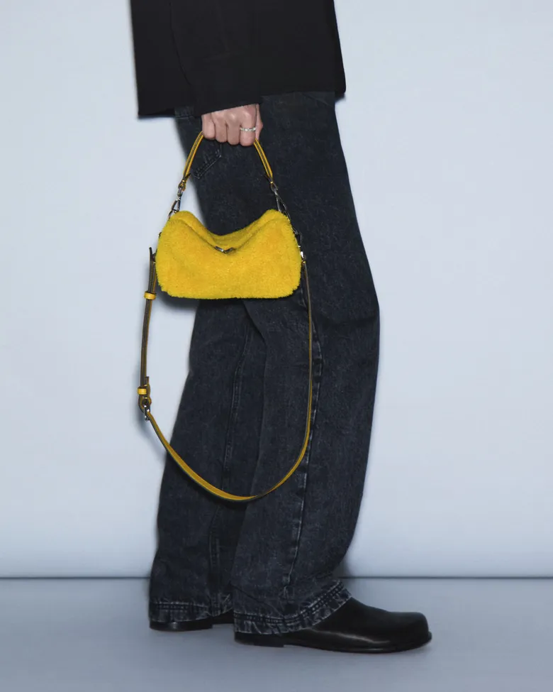 ブランドを象徴する「Baguette(バゲット)」バッグは、ダークブラウンのシアリング素材で包まれ、ぬいぐるみのような“テディイヤー”のディテールが印象的。取り外し可能なハンドルとショルダーストラップにより、ハンドバッグ、ショルダーバッグ、クロスボディバッグの3通りで使用可能。実用性とファッション性を兼ね備えた一品だ。