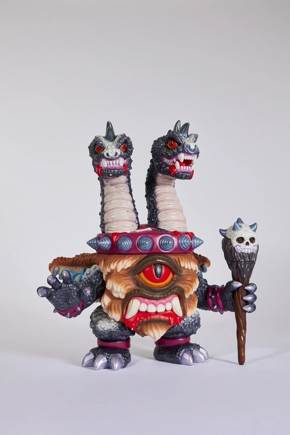 会場では、三つのシリーズが展開される。ホラー玩具やRPGのラスボス造形を引用した《Mushussu》シリーズでは、「恐怖」と「消費」の美学を交差させながら、失われた崇高さの再構築を試みる。《Heads》シリーズは、PEZヘッドや晒し首、宗教彫刻など異なる制度が交錯する「首」を通して、祀りと断罪の二面性を照射する。そして壁付けの祭壇に設置されたソフビ製ドラゴン像では、コレクションケースという現代の私的祭壇を逆用し、玩具へと還元された彫刻形式の実験が行われている。